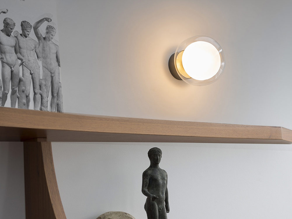 Un double globe sphérique en verre borosilicaté diffuse une lumière raffinée, soutenu par une structure en métal revêtu de poudre époxy, enrichie de finitions en laiton brossé ou en chrome noir.