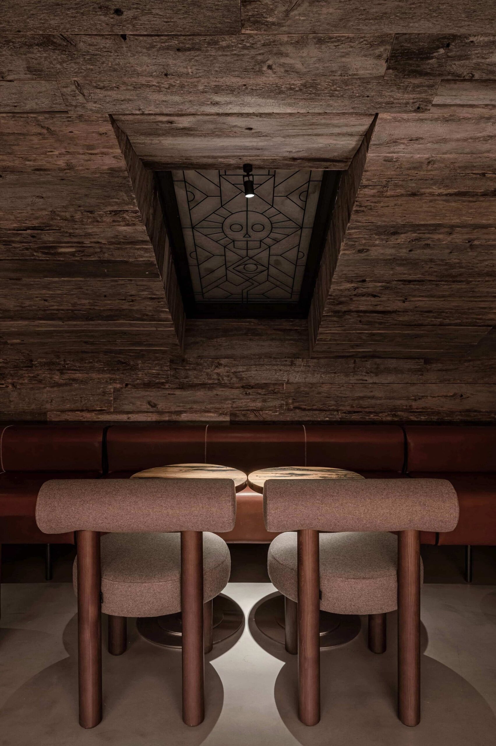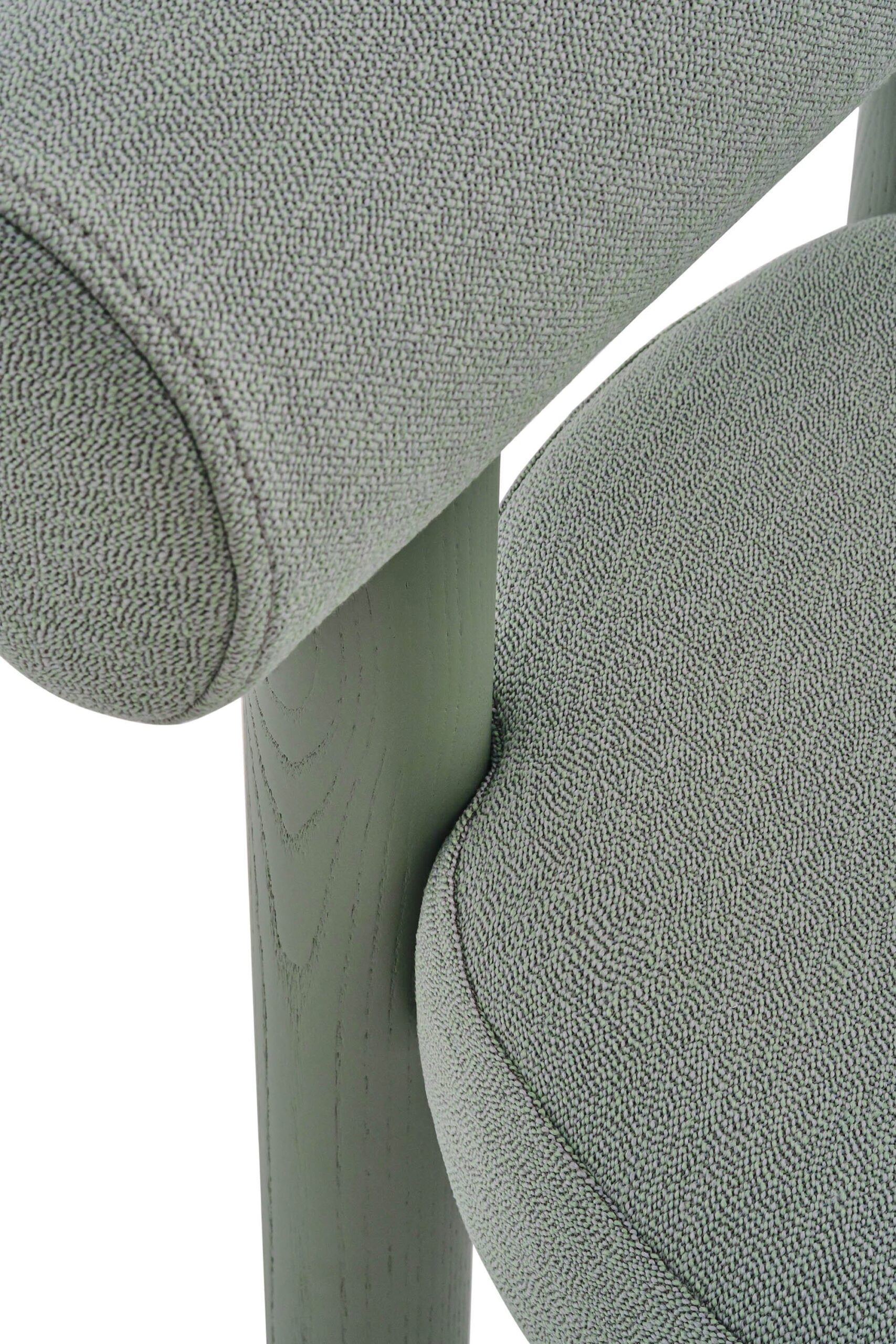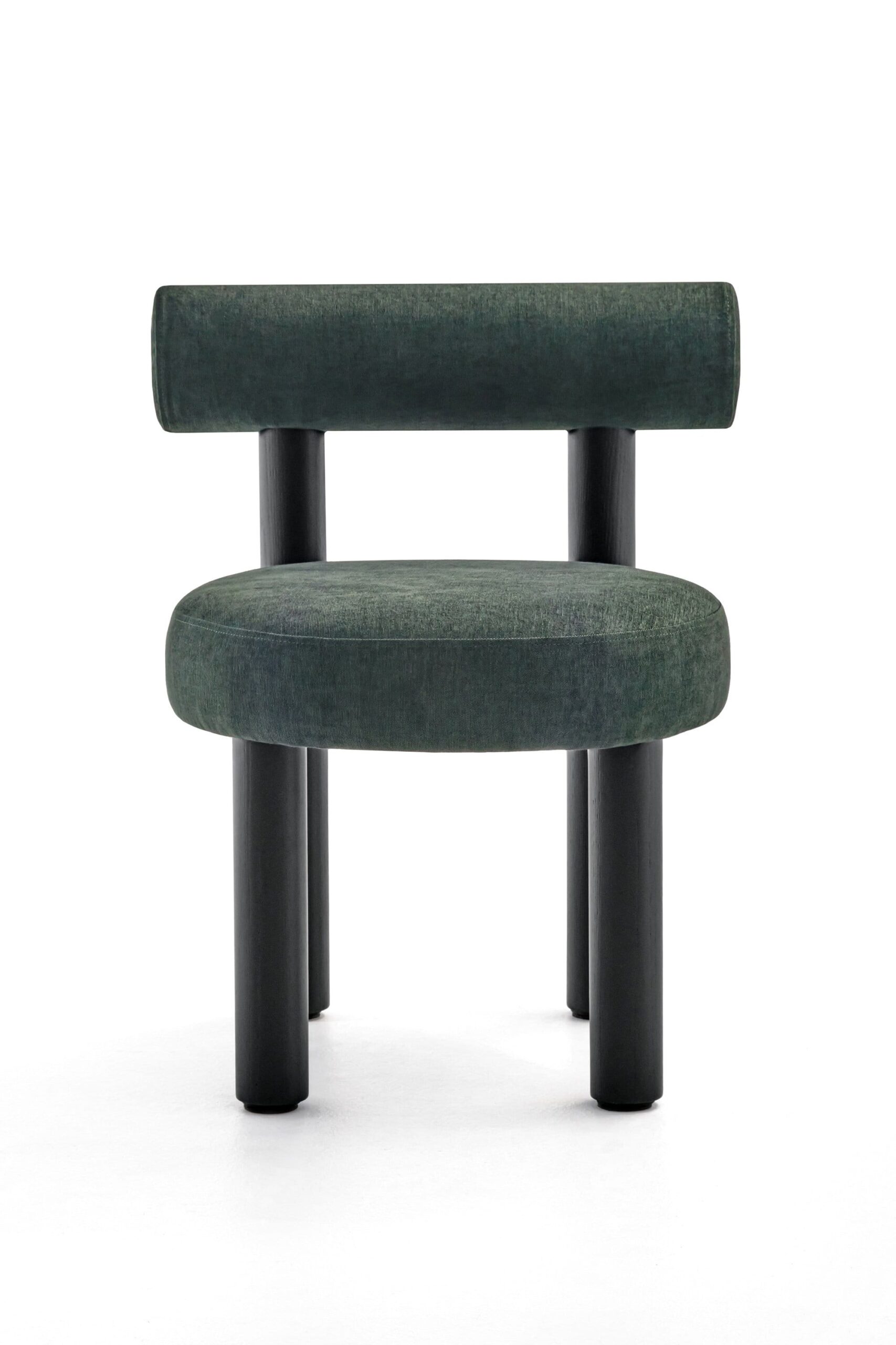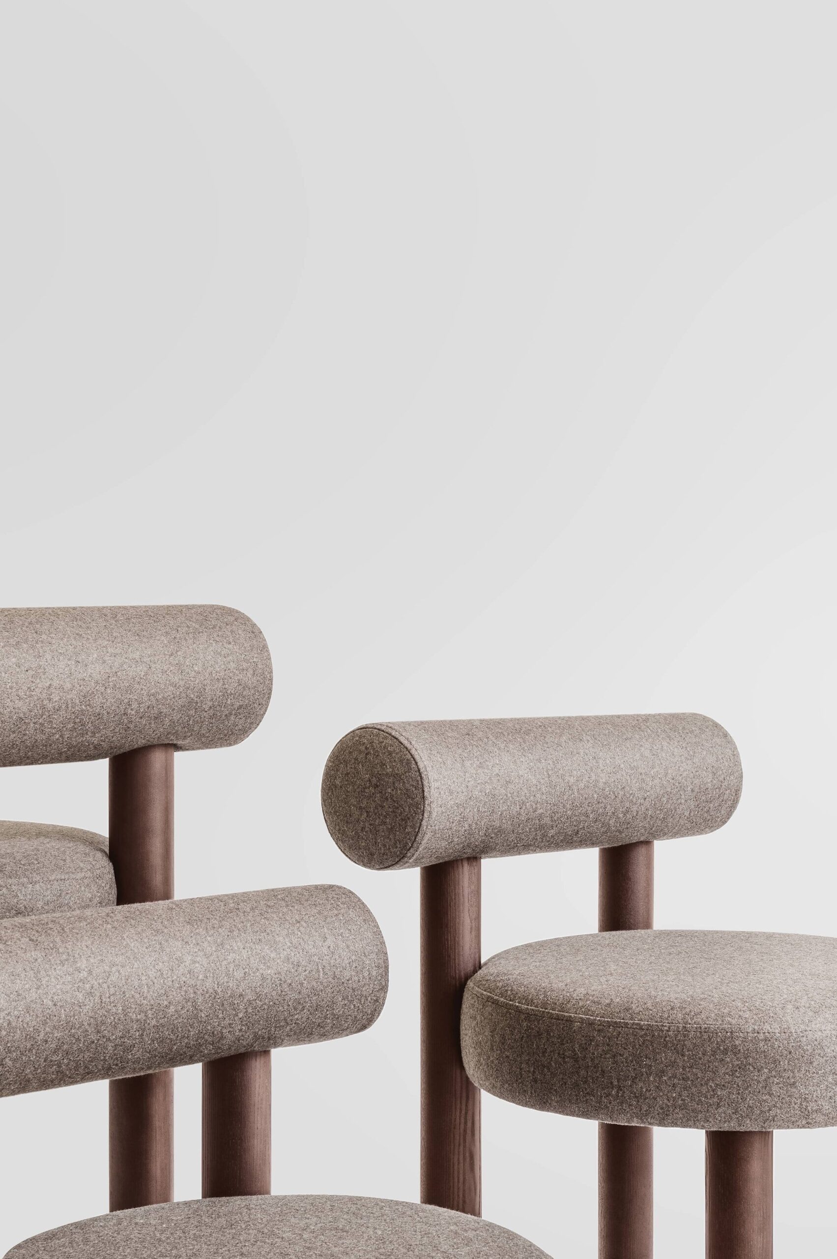 Sa solide structure en bois massif soutient un cylindre servant de dossier et une assise rembourrée en cercle donnant naissance à une composition de formes géométriques simples, qui fait de Gropius un produit purement design.