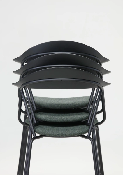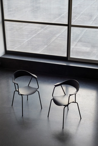 Le défi relevé par sa conception fut de créer une chaise empilable, dotée d’accoudoirs, tout en conservant finesse et élégance afin de permettre d’en disposer plusieurs autour d’une table sans alourdir l’ensemble.