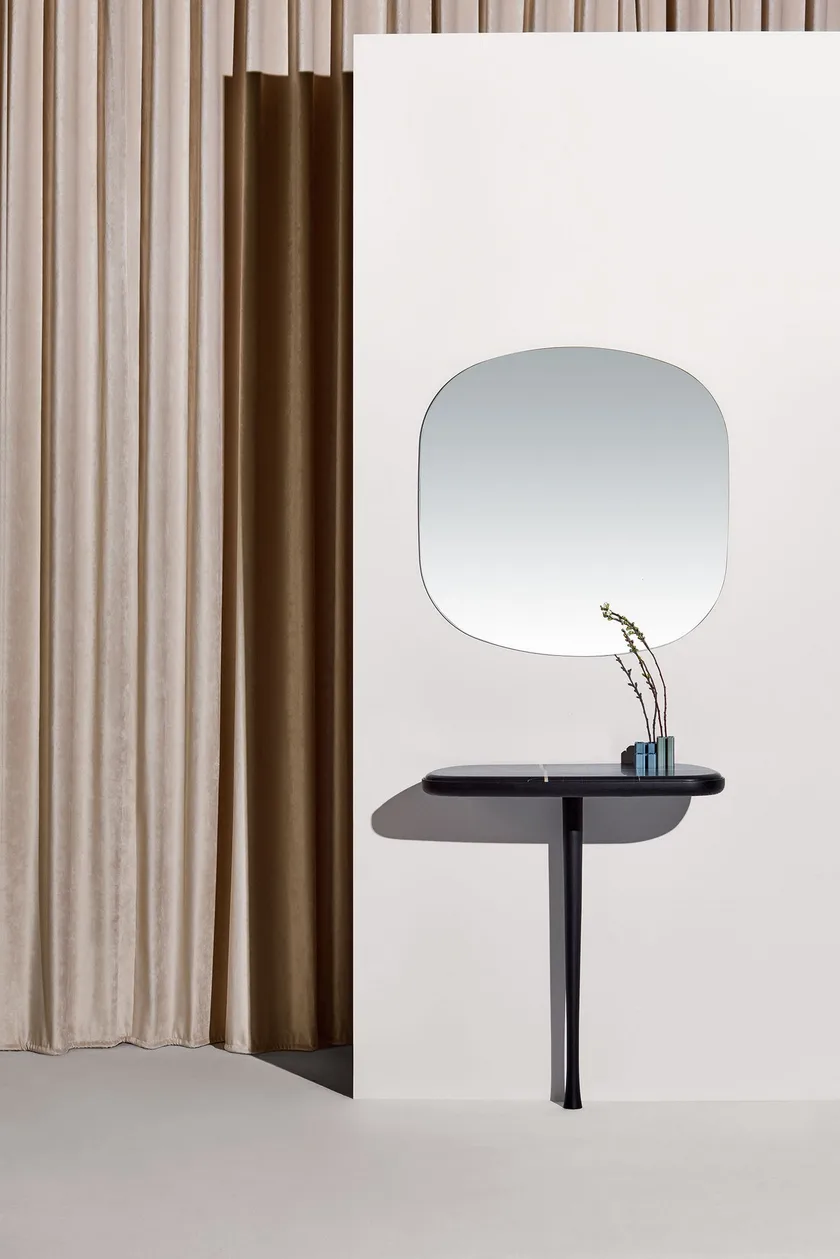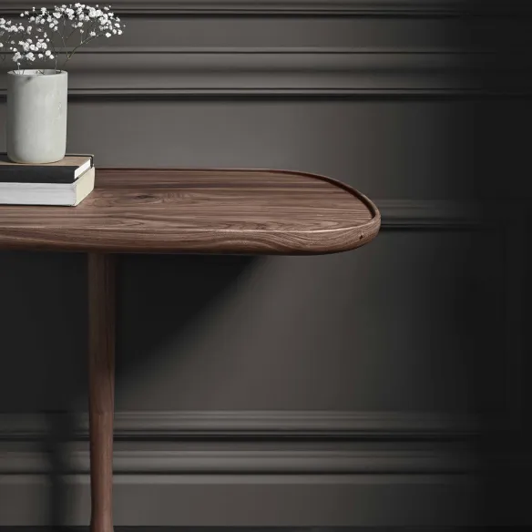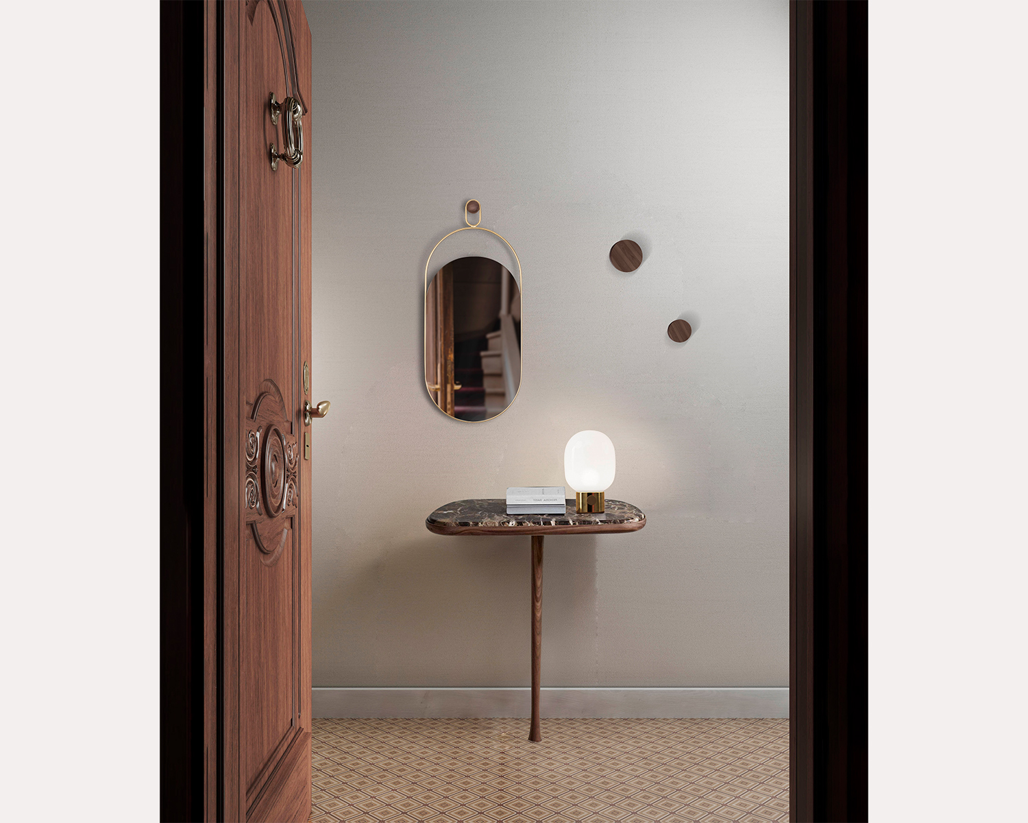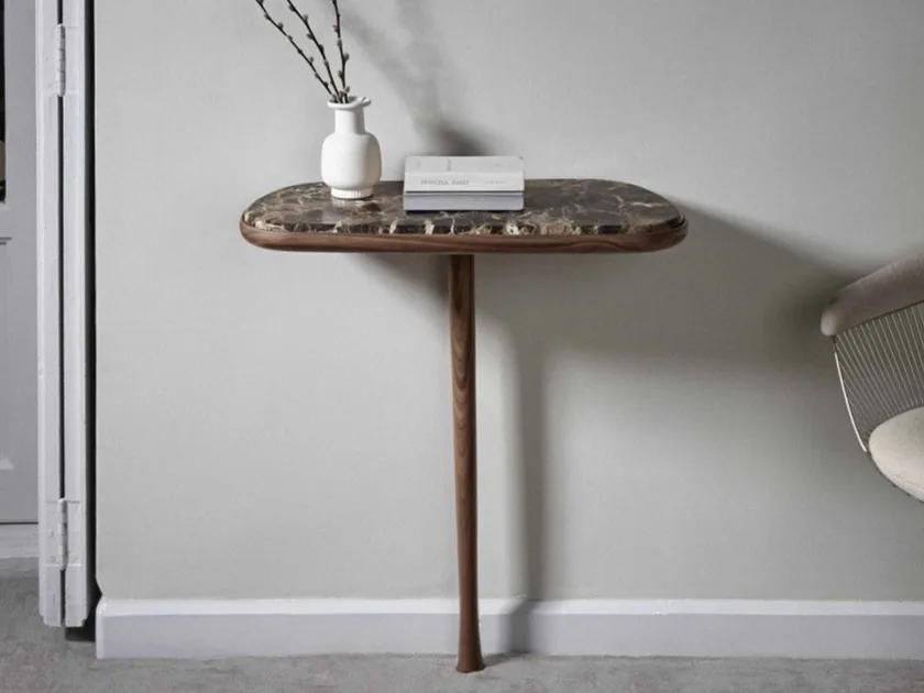 Consola de Nomon allie le noyer massif et des détails luxueux comme le marbre, suspendue avec légèreté grâce à un piètement invisible, traduisant un design où fonctionnalité, poésie et élégance transforment chaque espace.