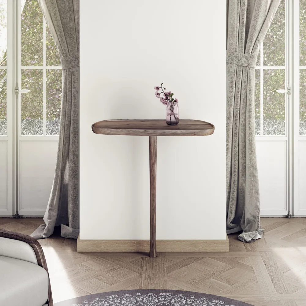 Façonnée en noyer massif, ponctuée de détails luxueux tel que le marbre et les arrondies du bois, cette console semble flotter dans l’espace : son piètement central dissimule des fixations murales invisibles, défiant la gravité avec légèreté.