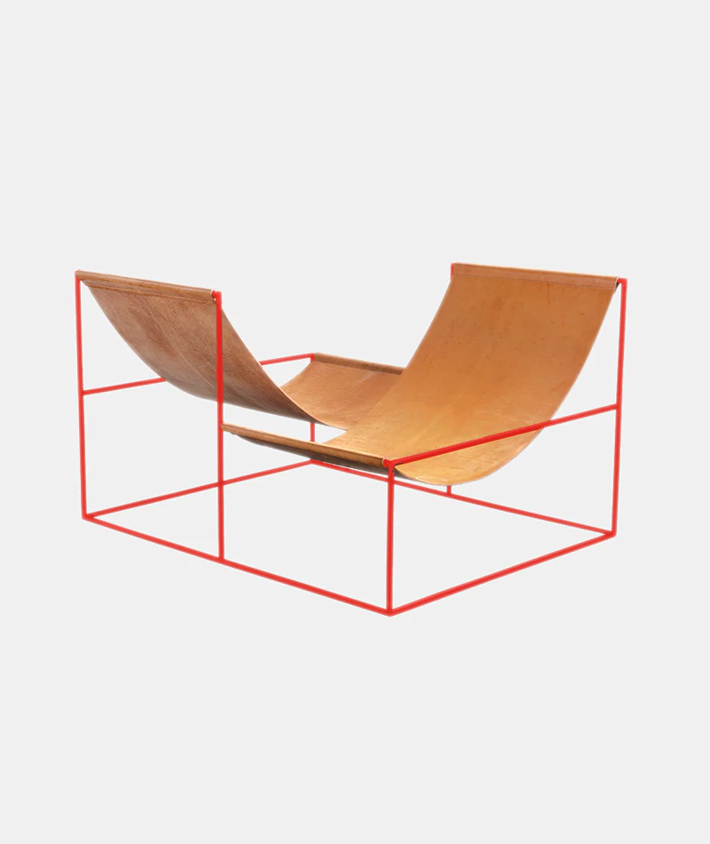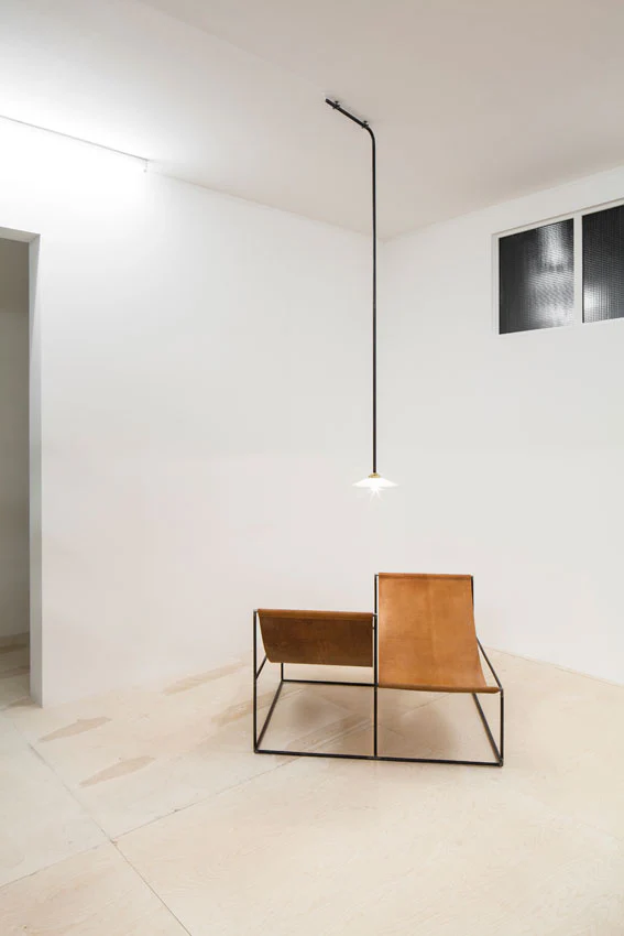 Contrairement au duoseat + lamp ( autre pièce de la collection), qui rapproche sans permettre le regard de ses utilisateur, Crossed double seat favorise une relation frontale. L’espace vide sous le siège est strictement délimité, tandis que les bandes de cuir croisées assurent l’équilibre visuel et structurel de l’ensemble.