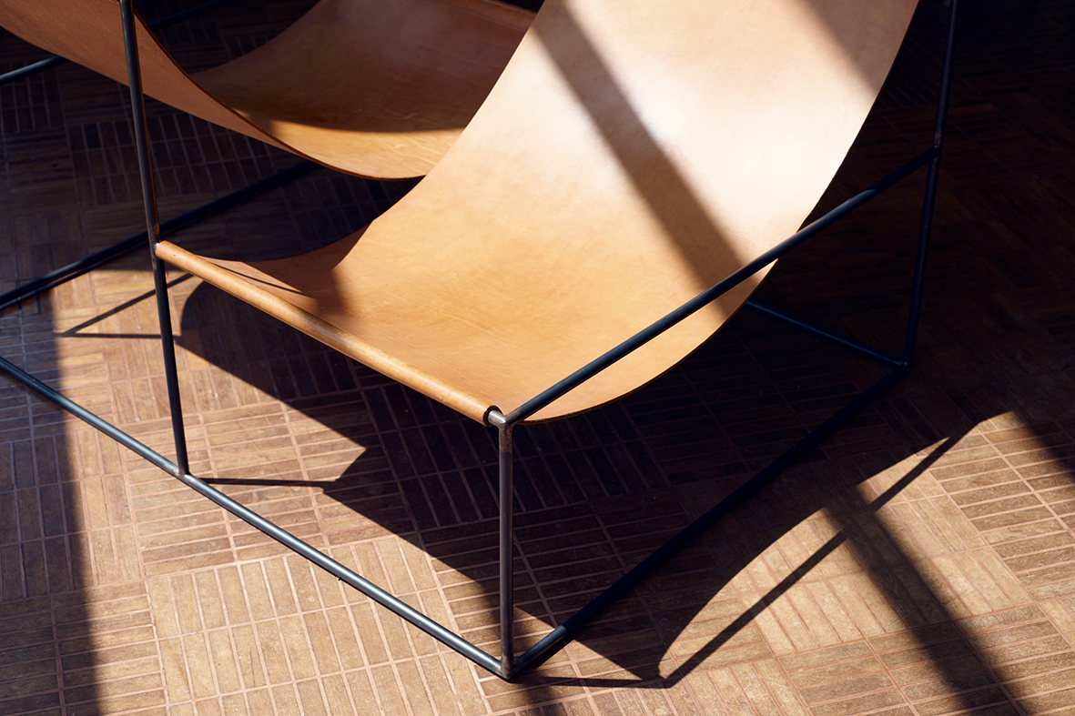La pièce est réalisée à partir d’un cadre en acier sur lequel est tendue, puis cousue à la main, une toile en cuir naturel.