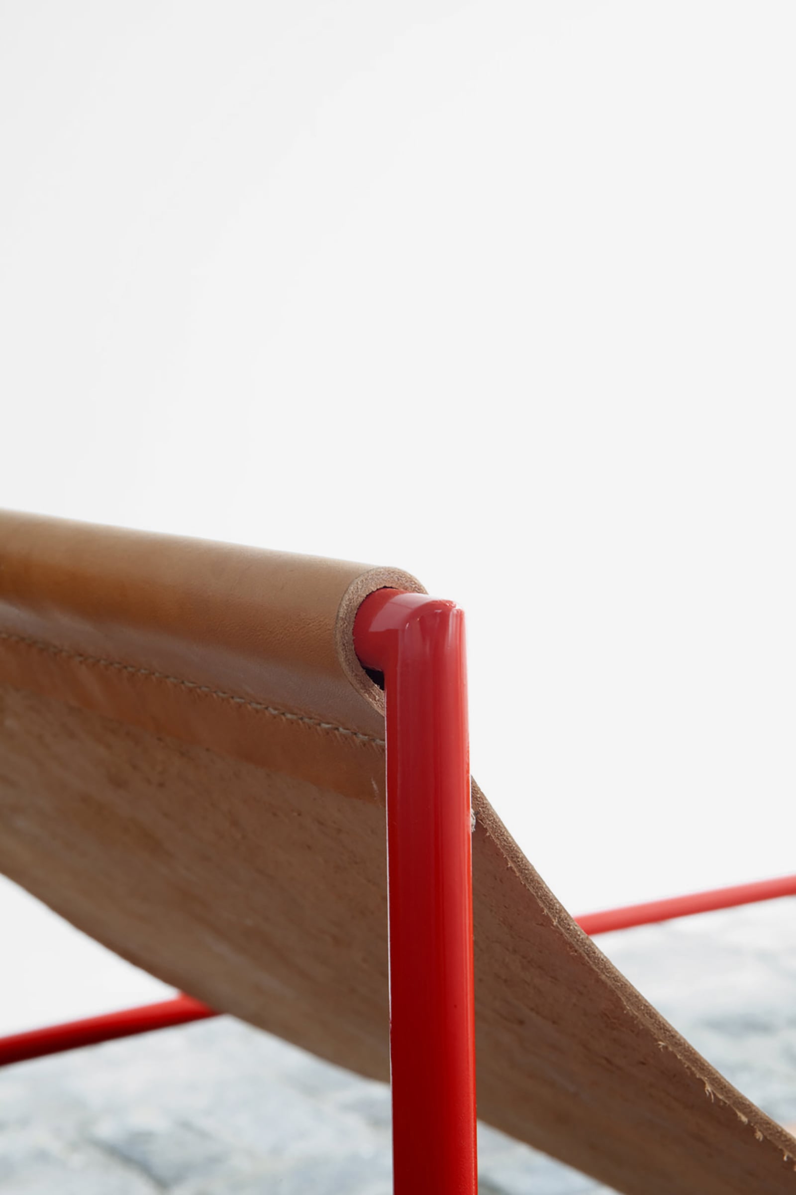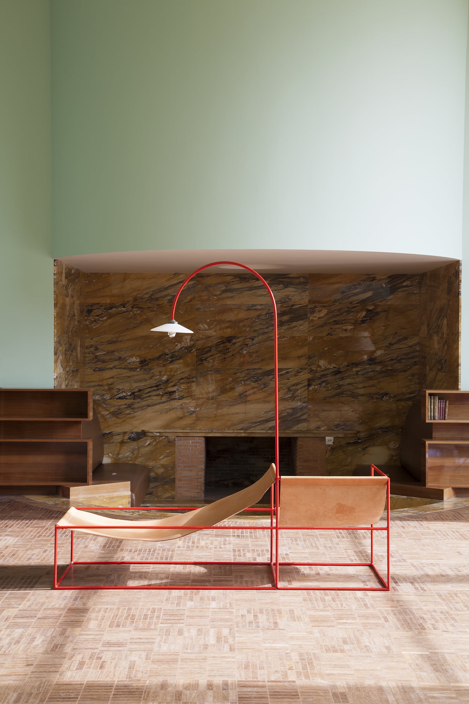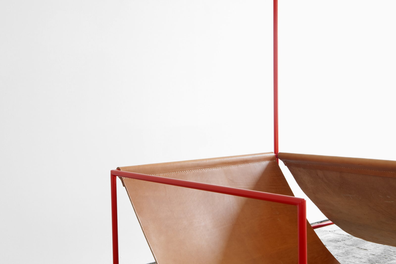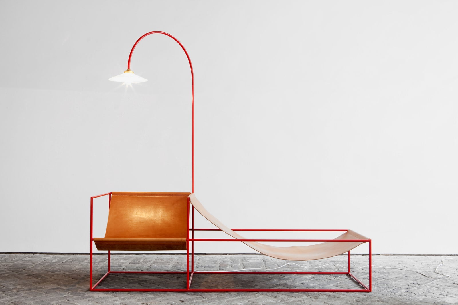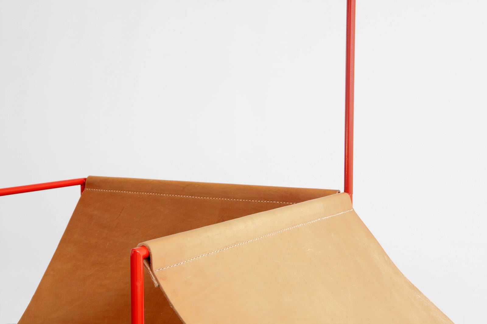 Le duo siège + lampe a été présenté fin 2011 lors de Design Brussels. Cet objet juxtapose deux sièges en acier laqué et cuir naturel cousus à la main au cadre. La forme rectangulaire de l’objet contraste avec les tissus en cuir en forme d’arc. Le dossier d’un siège devient le bras du second. Il est fabriqué avec des barres d’acier rondes au lieu de profilés carrés ou en forme de L comme la série précédente. La raison en est l’accent mis sur les sièges. Muller Van Severen souhaite proposer la manière la plus simple de concevoir un siège ; en accrochant un morceau de tissu entre deux barres. Le duo siège + lampe incite les gens à s’asseoir très près sans se voir.