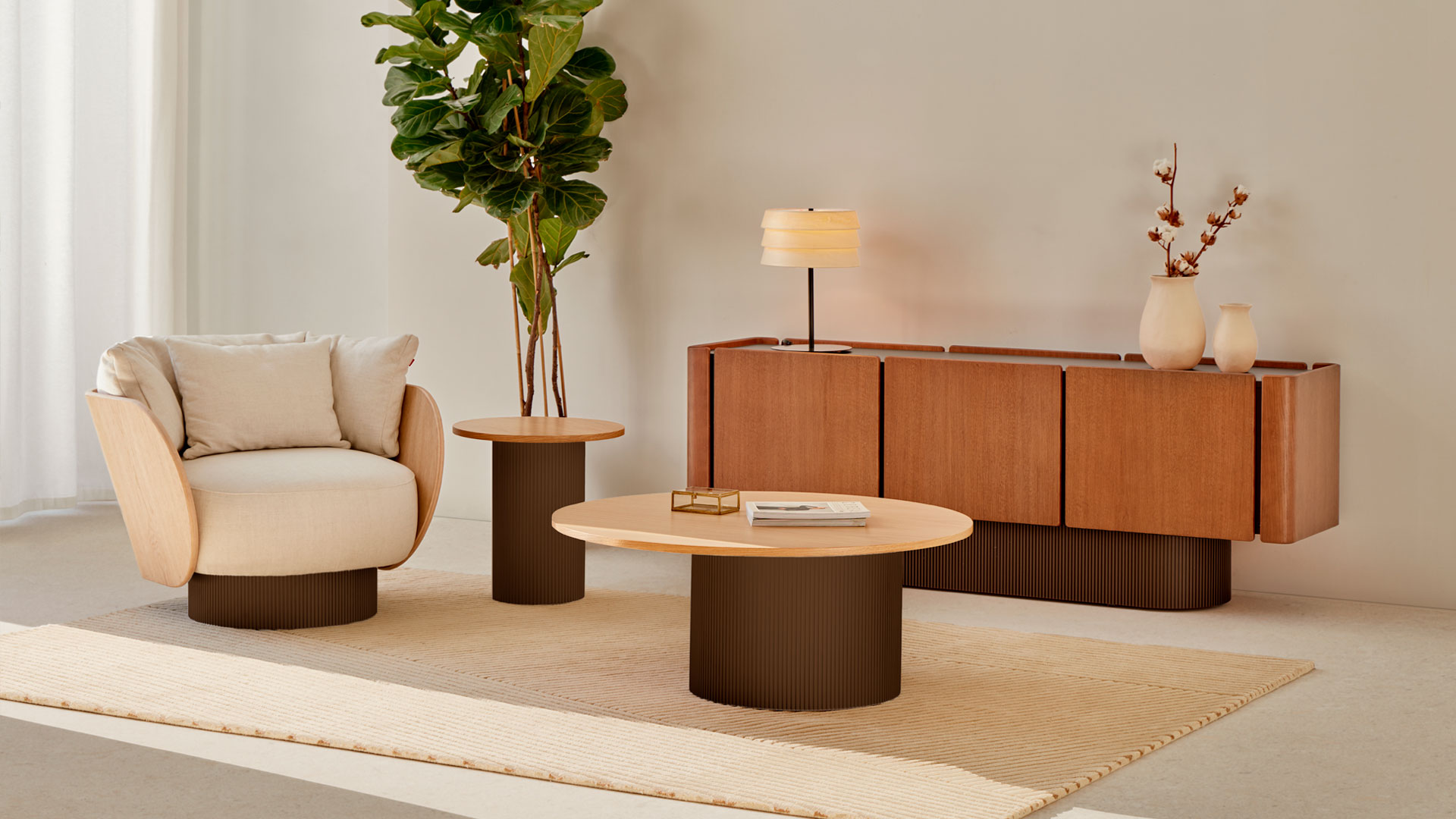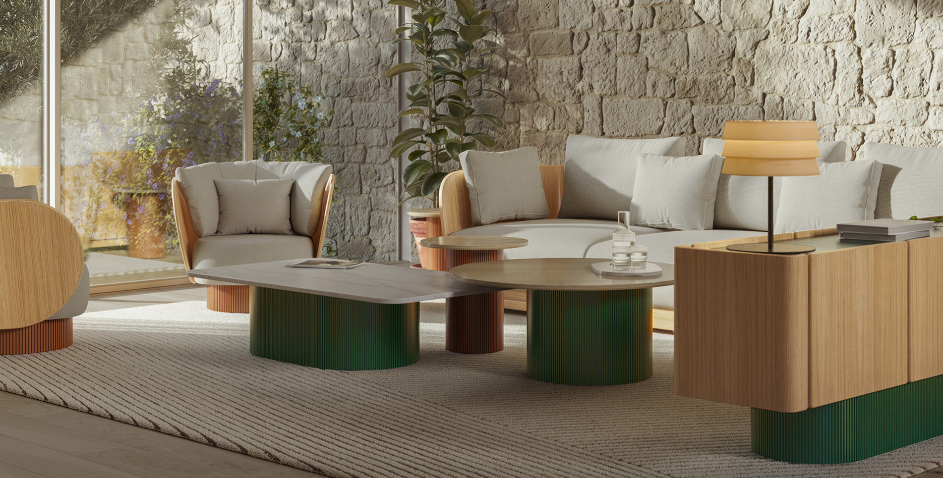 Chaque pièce déploie des courbes généreuses et des lignes souples, ponctuées de striures ondoyantes qui rappellent les traces du vent sur les dunes.