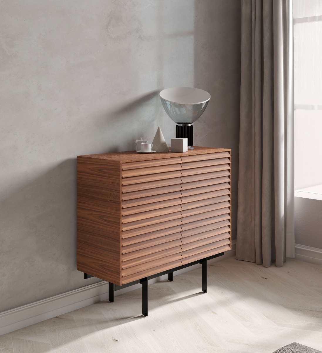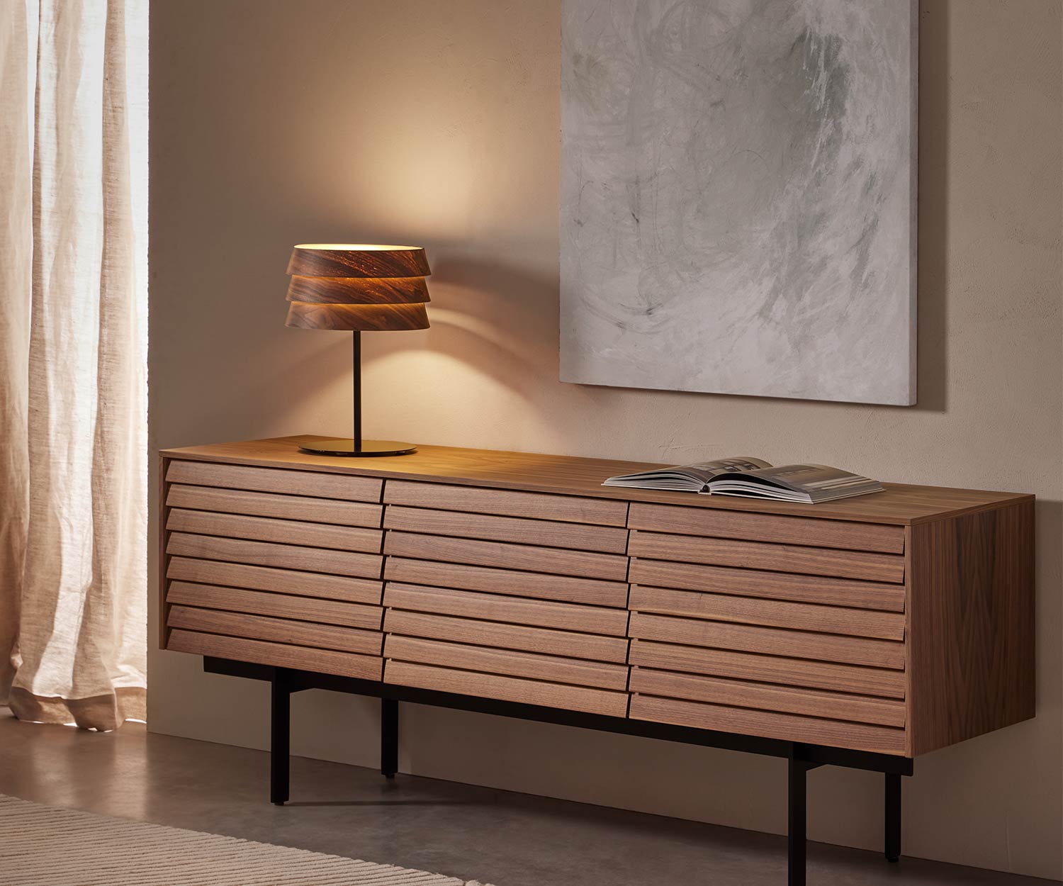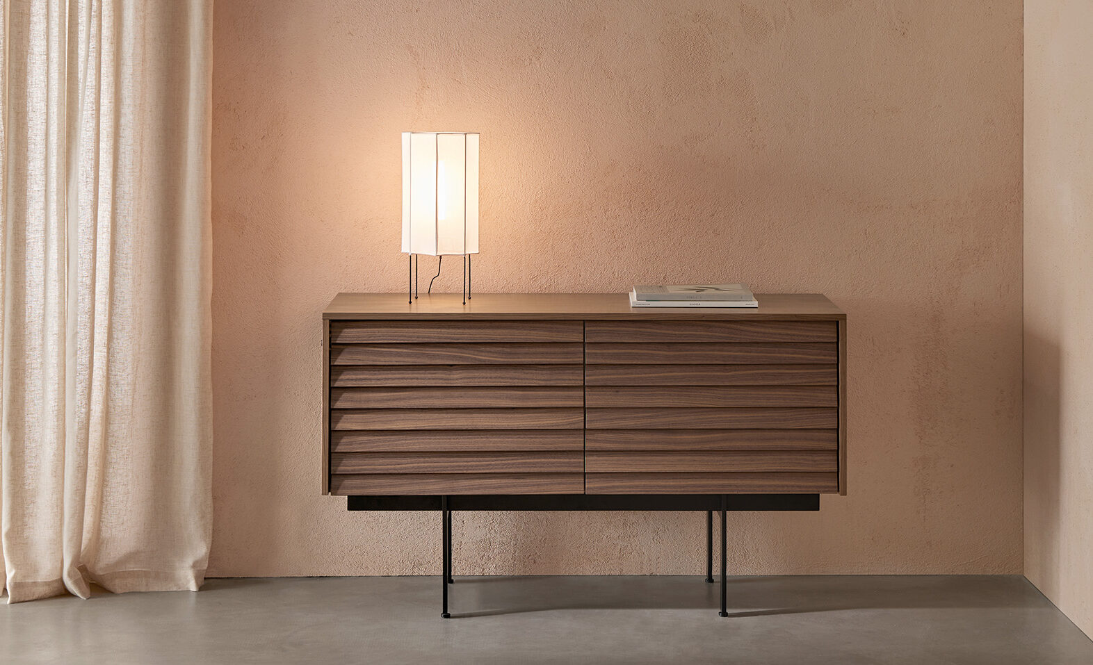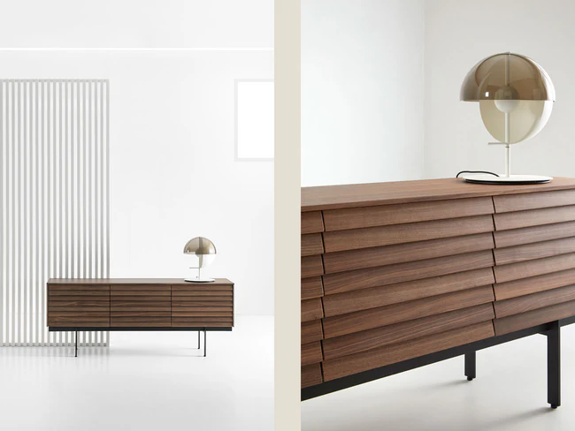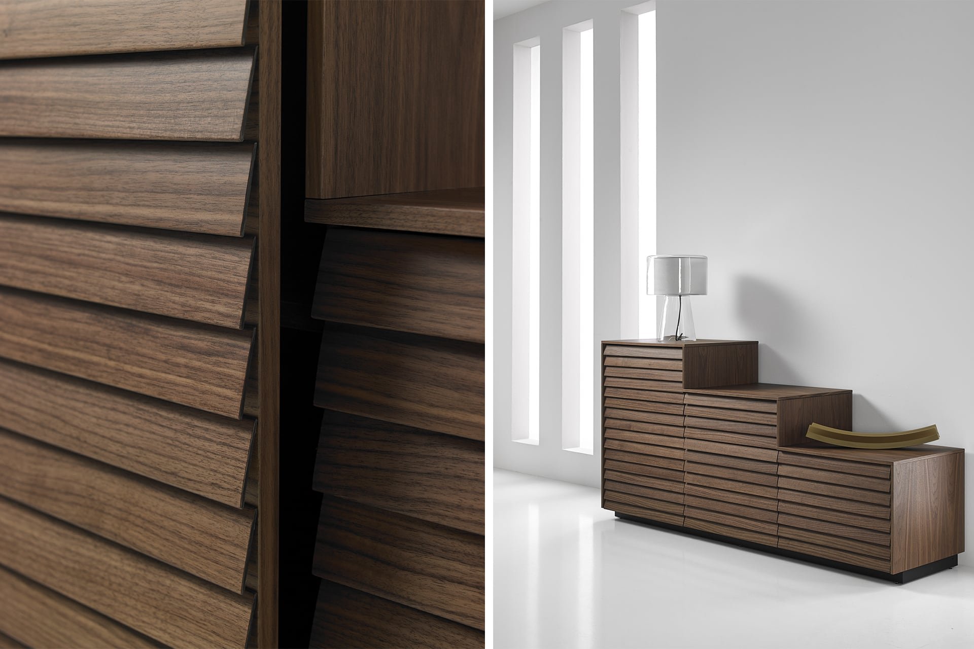 Sussex est une collection de buffets et de meubles TV dont la façade se distingue par un jeu exclusif de lames horizontales, dissimulant la composition tout en servant de poignées discrètes pour portes et tiroirs.