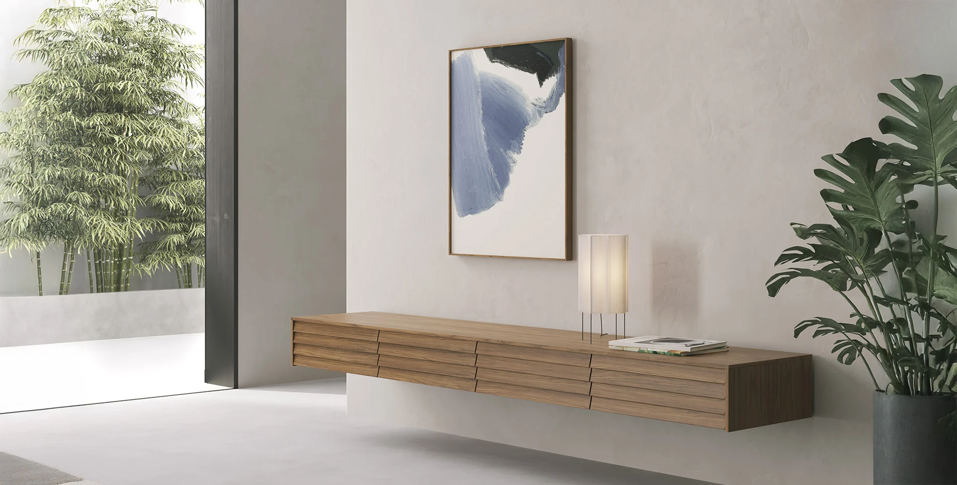 La collection Sussex, avec ses façades en lames horizontales qui allient esthétisme et fonction, se décline en multiples dimensions et finitions sur socle, pieds réglables ou en suspension, offrant des solutions raffinées et modulables adaptées à chaque espace.