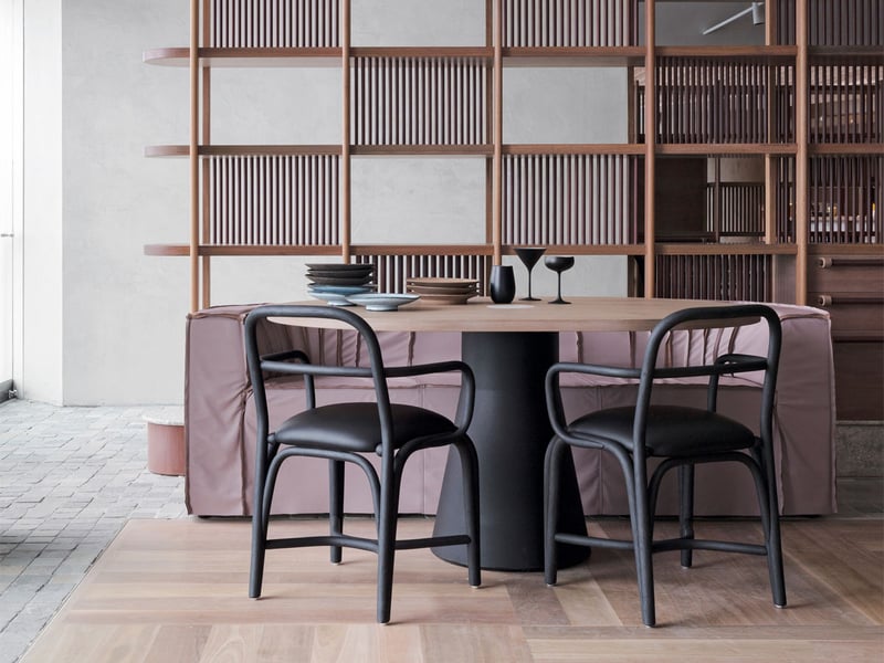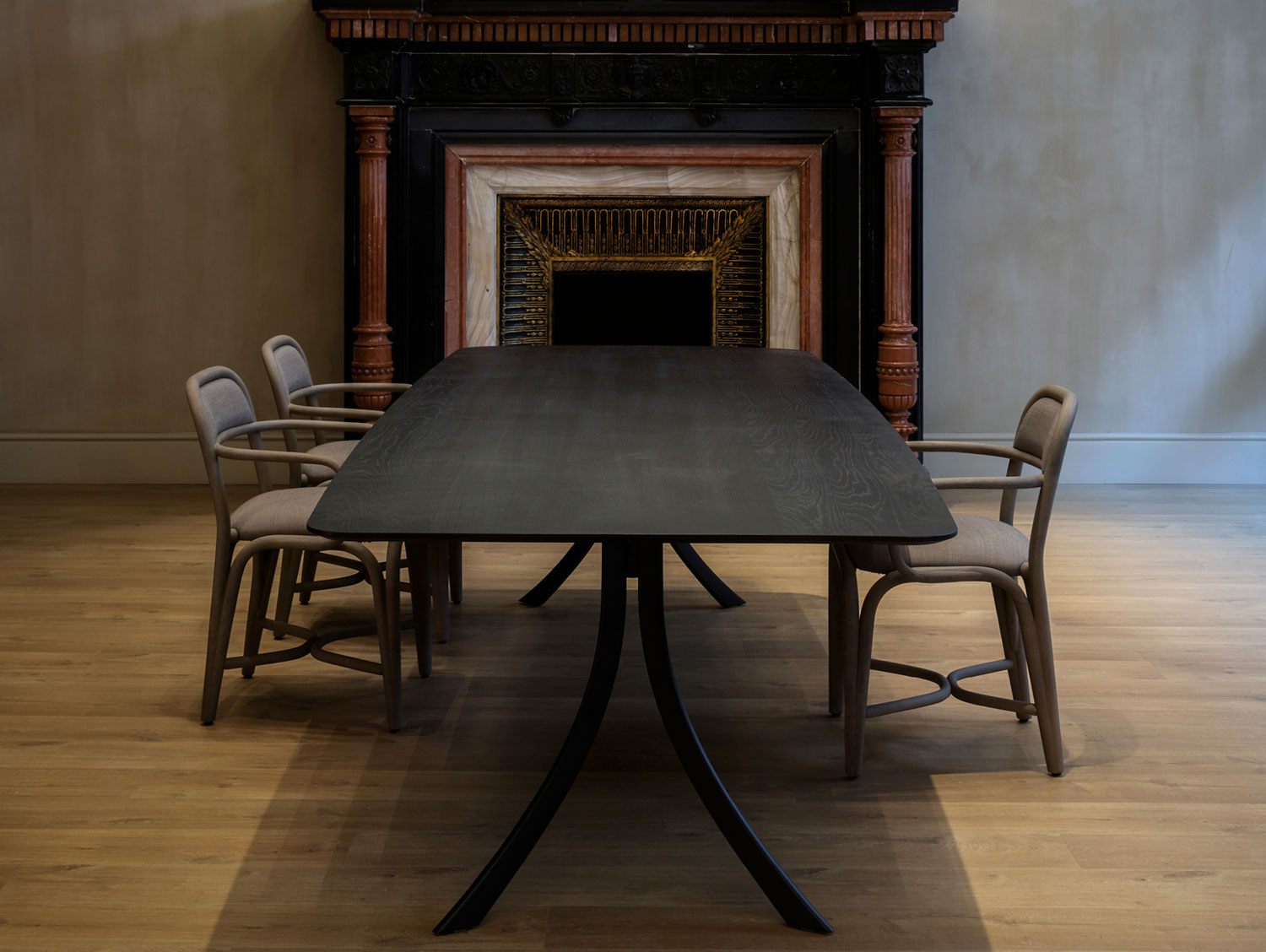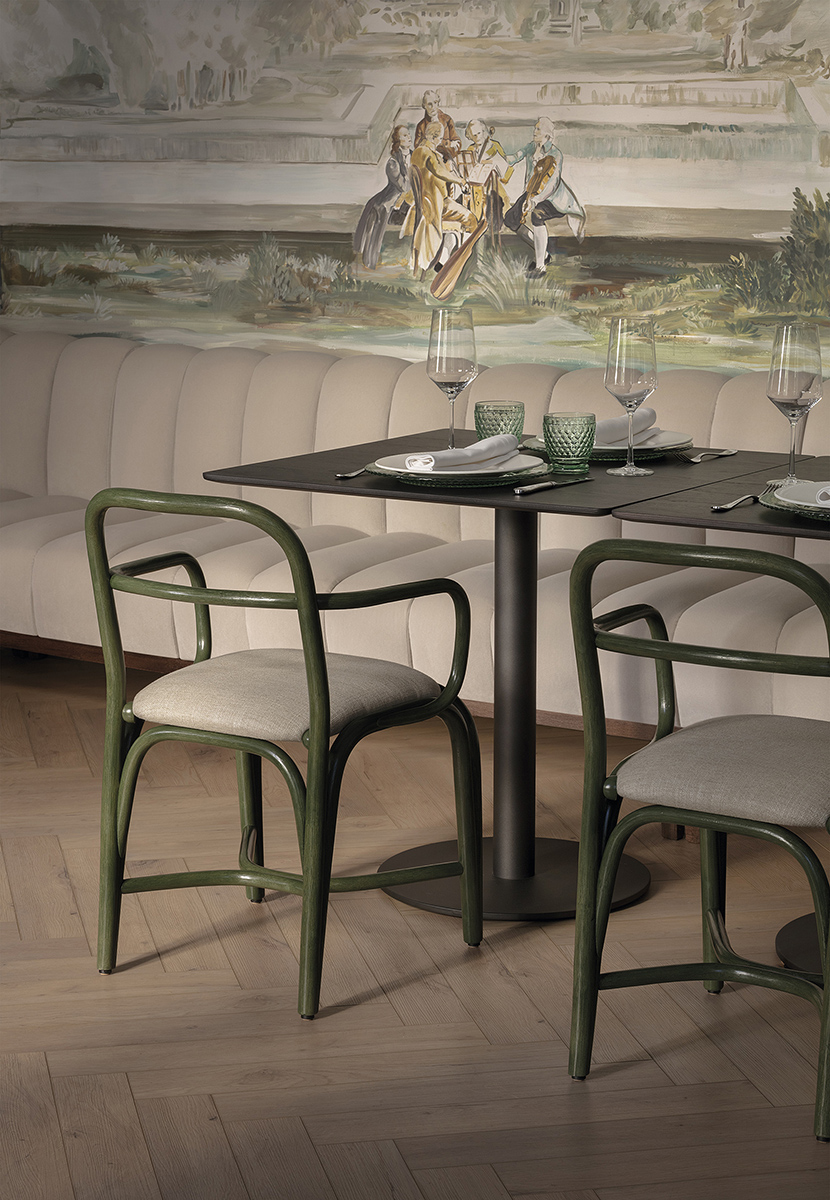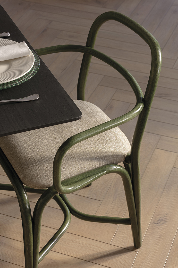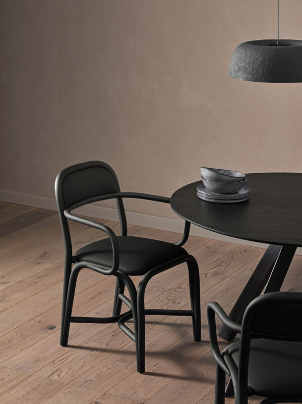 Pensée comme une pièce à la fois fonctionnelle et sculpturale, la chaise conjugue légèreté et solidité, héritage artisanal et modernité. Des patins discrets, posés au pied de sa structure, veillent enfin à préserver les sols et parfaire l’attention portée au moindre détail.