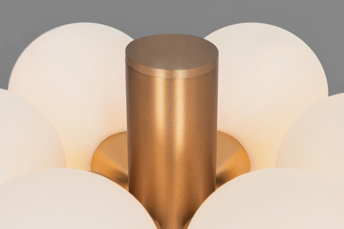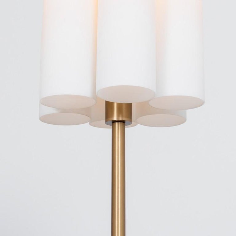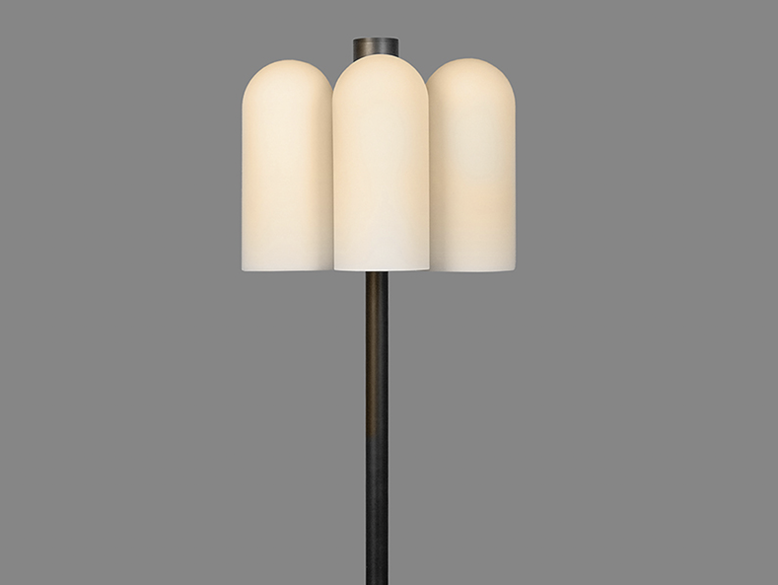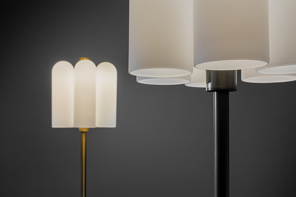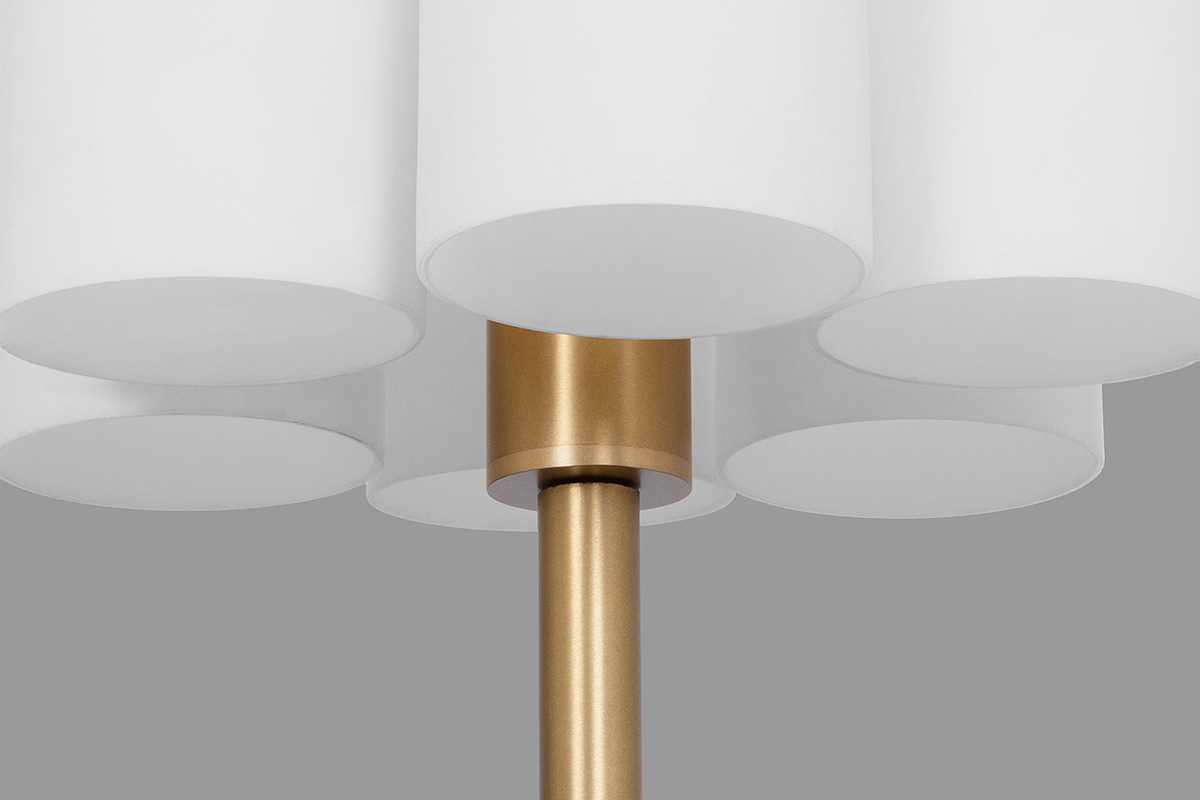 Sa silhouette élancée, à la fois sobre et imposante, associe la solidité du laiton massif à la délicatesse de diffuseurs en verre soufflé. Chaque élément est conçu avec une attention particulière aux proportions et aux détails, pour offrir une lumière à la fois fonctionnelle et atmosphérique.
