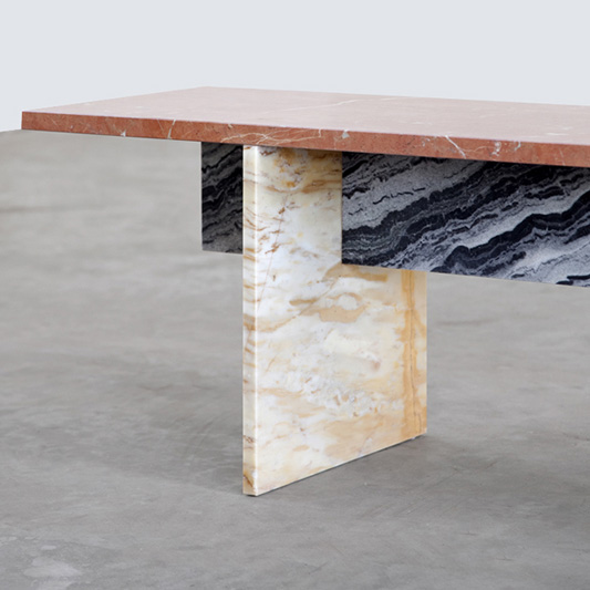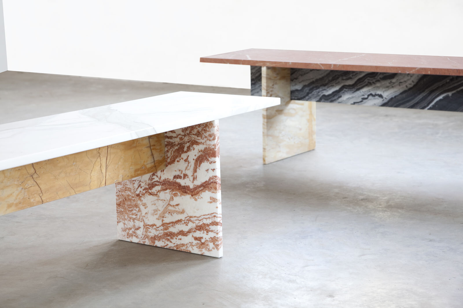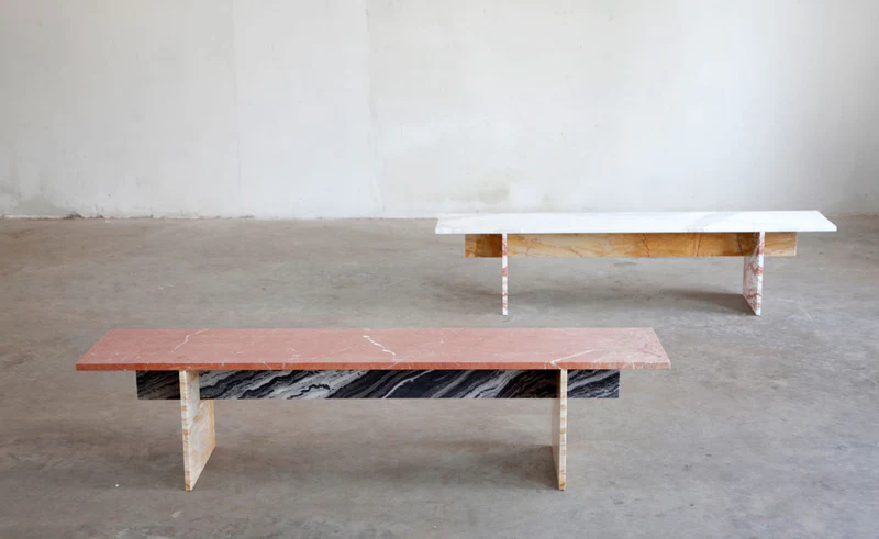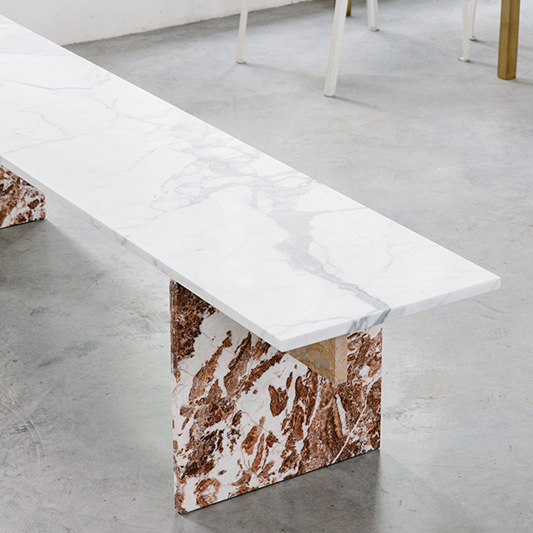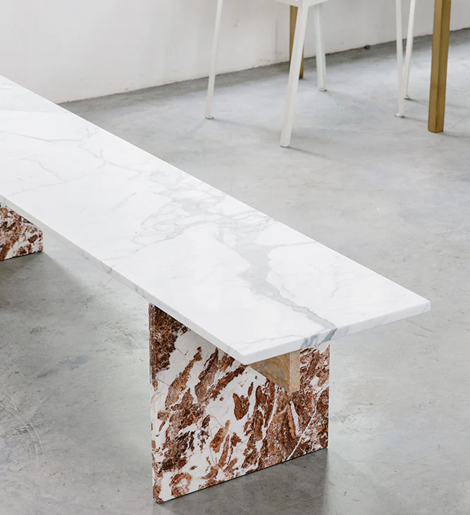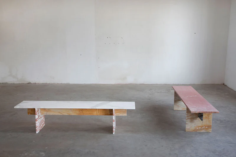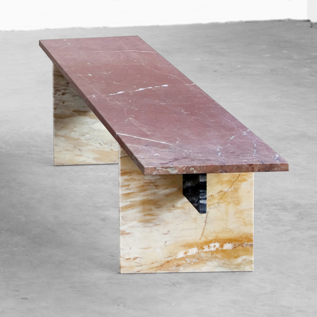 Le marbre est un matériau qui les accompagne depuis leur débuts. Par exemple lors de leur première exposition en 2011, ils ont présenté Marble Box, une exploration des dialogues possibles entre différentes variétés de marbre, réunies dans une structure simple. Marble bench prolonge cette réflexion : un objet minimal, mais riche en nuances, où les teintes et textures du marbre se rencontrent et se répondent, presque comme une composition picturale.