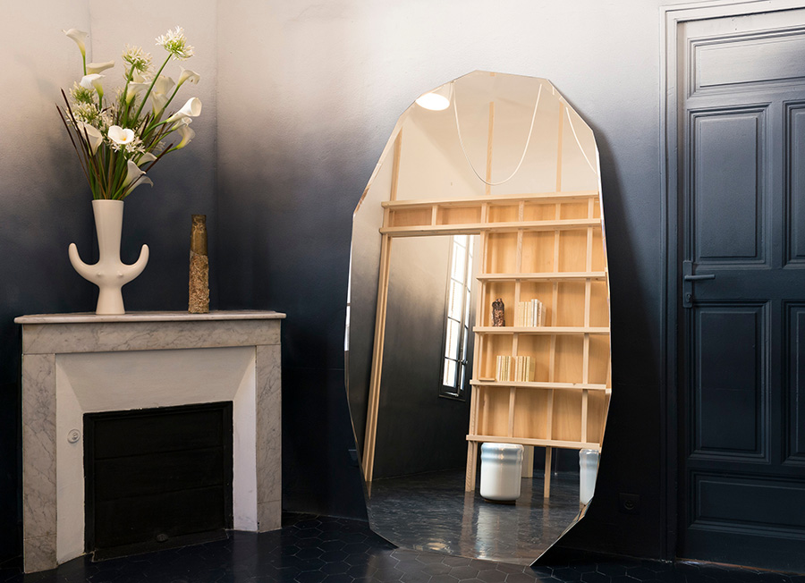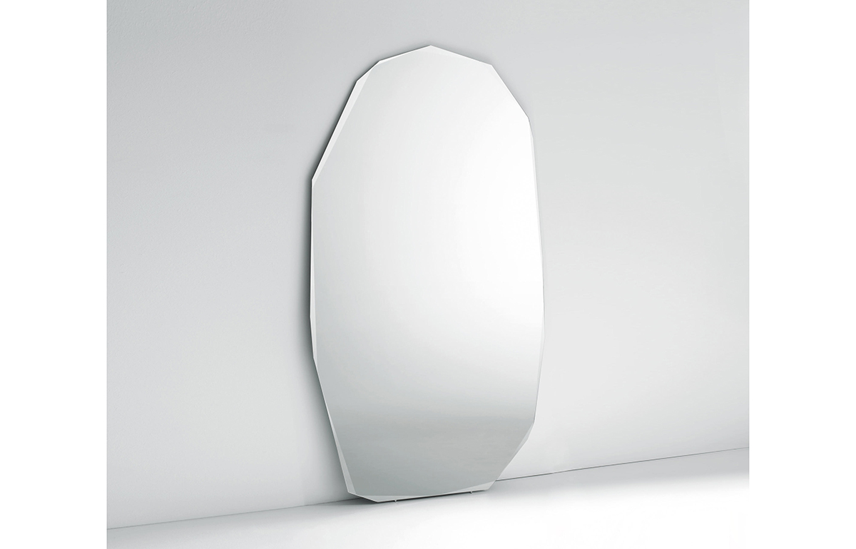 Le miroir Kooh-I-Noor de Piero Lissoni pour Glas Italia, aux formes irrégulières et bords biseautés en facette, capte la lumière avec profondeur et poésie pour un style brut et naturel.