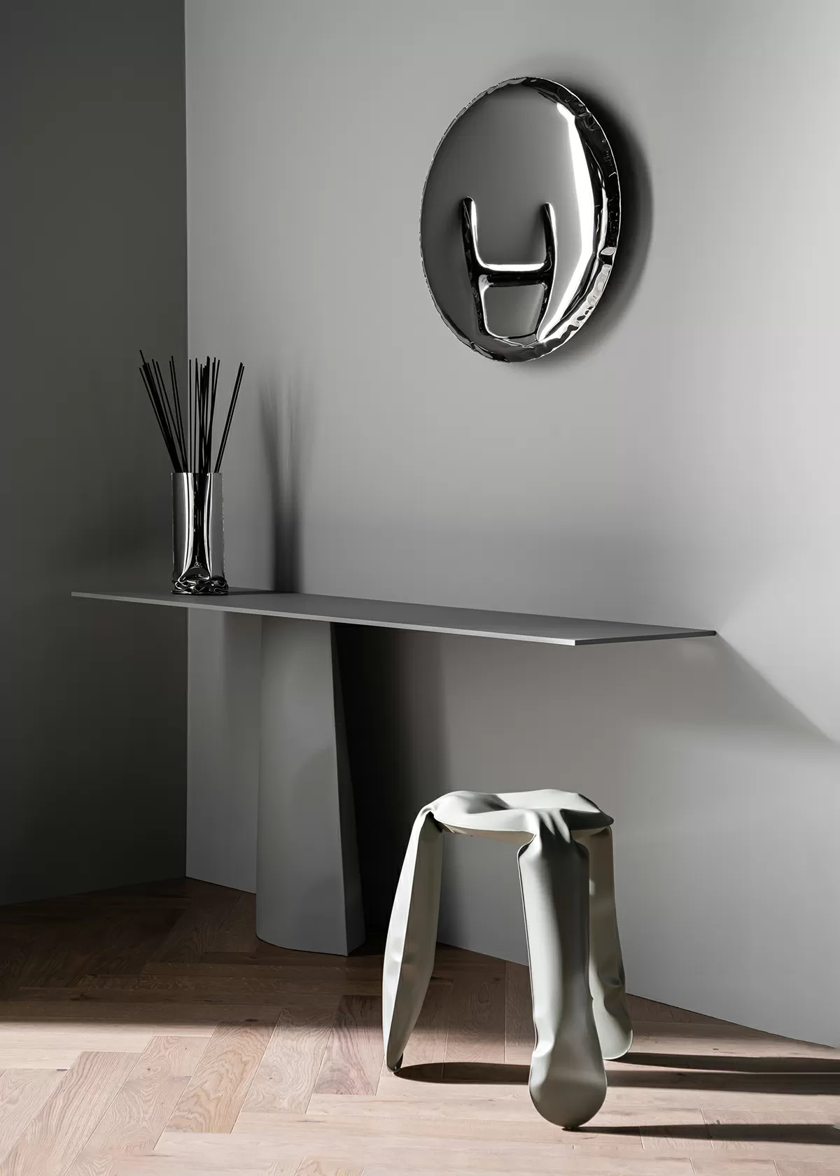 C’est une sculpture légère inspirée par des formes organiques semblables à des liquides et ressemble à une énorme gouttelette de mercure argenté.