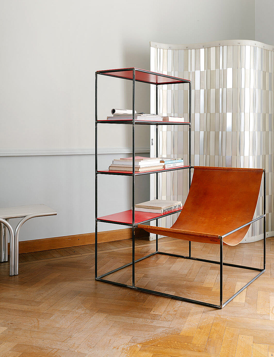 Rack + Seat combine assise en cuir naturel et étagères en polyéthylène dans un équilibre sobre et réfléchi. Conçu en 2012 pour la Biennale Interieur, il est fabriqué à la main en Belgique.