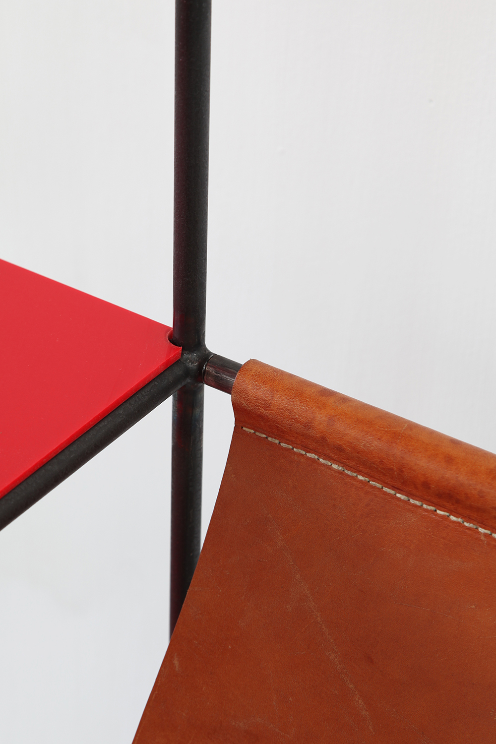 Muller Van Severen a voulu que le confort naisse de la justesse du geste. Les détails comptent : les soudures en acier sont travaillées avec précision, et les étagères en polyéthylène, ce matériau modeste que Muller Van Severen affectionnent et utilises depuis le début sont adoucies par des arêtes sculptées.