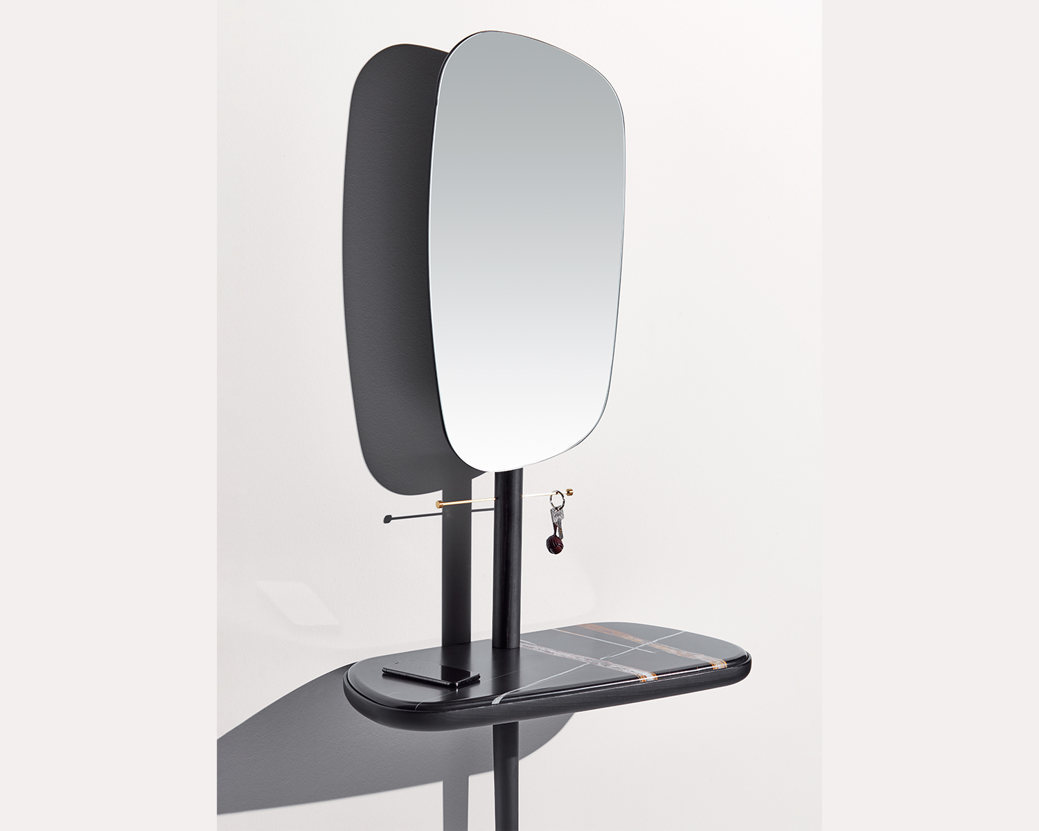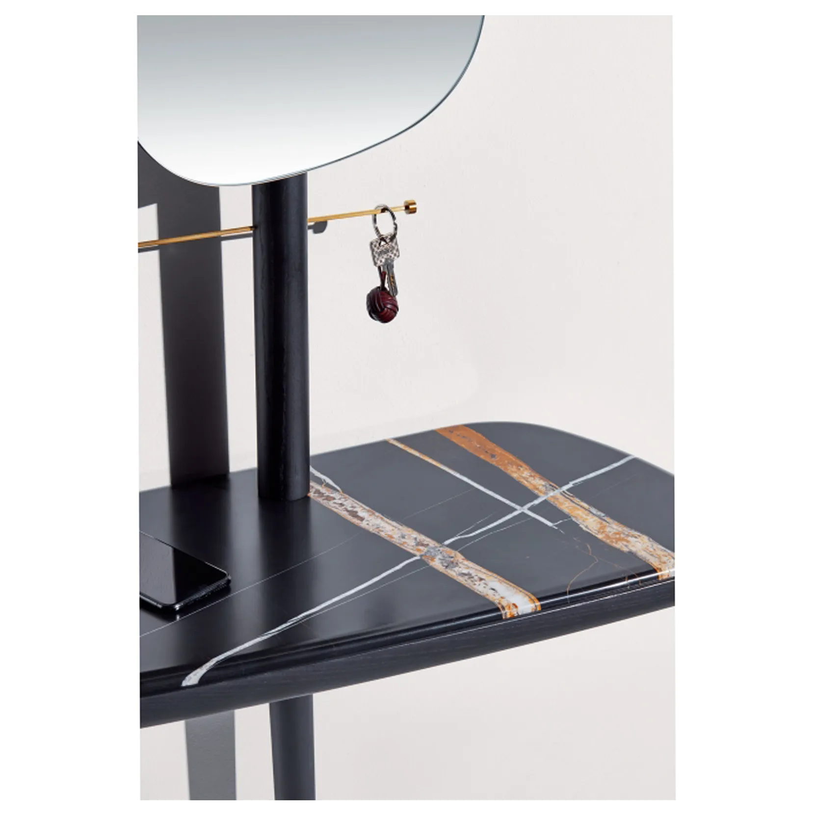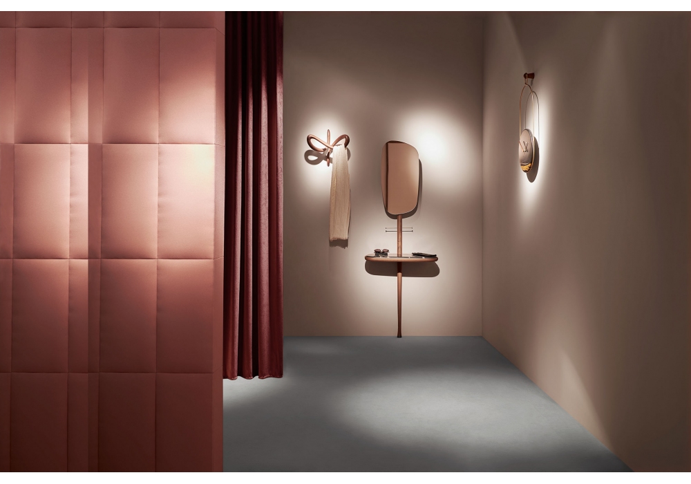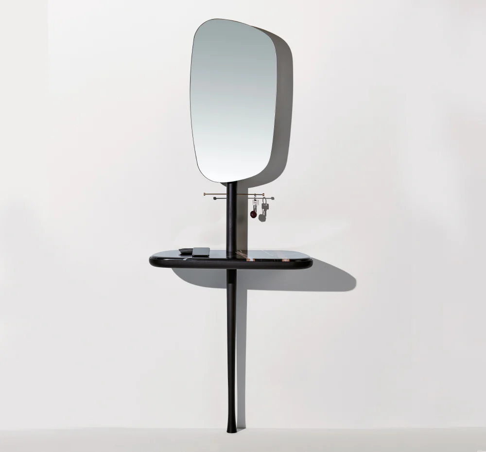 Recibidor de Nomon allie la chaleur du noyer et l’éclat du laiton dans une console suspendue à l’élégance aérienne, où un miroir pivotant joue avec la lumière et la perspective.
