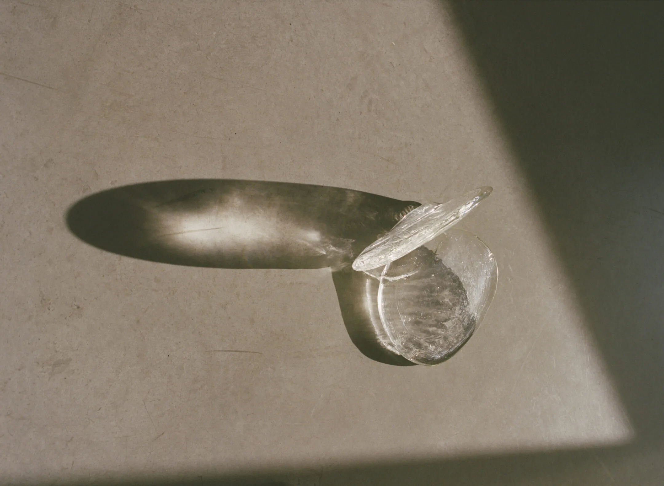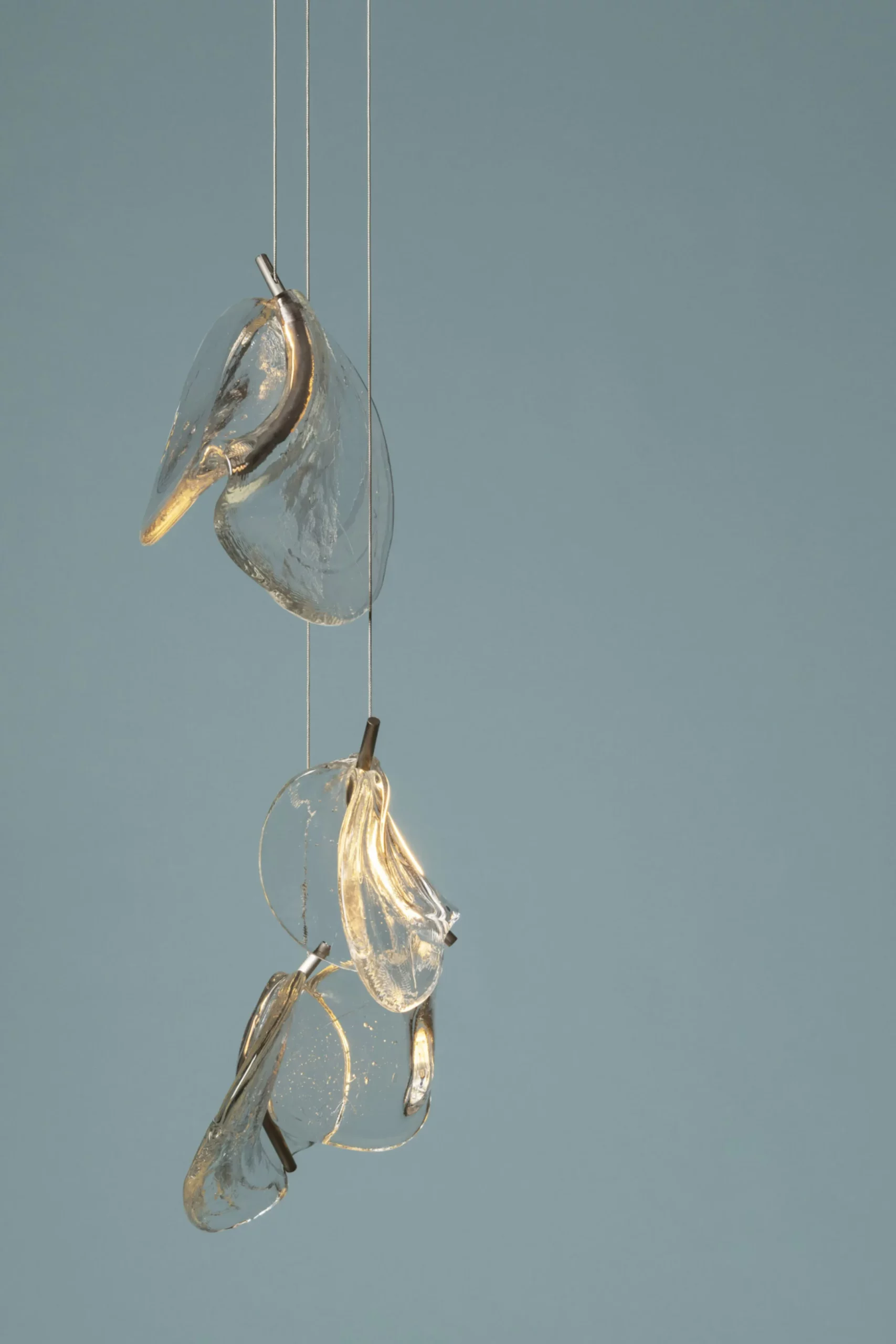 La série 141 est entièrement façonnée à la main. Son processus de création repose sur deux louches de verre aplati, fusionnées à la flamme pour donner naissance à une forme sculpturale. Suspendu, l’élément de verre évoque des ailes en apesanteur, diffusant une lumière douce et poétique.