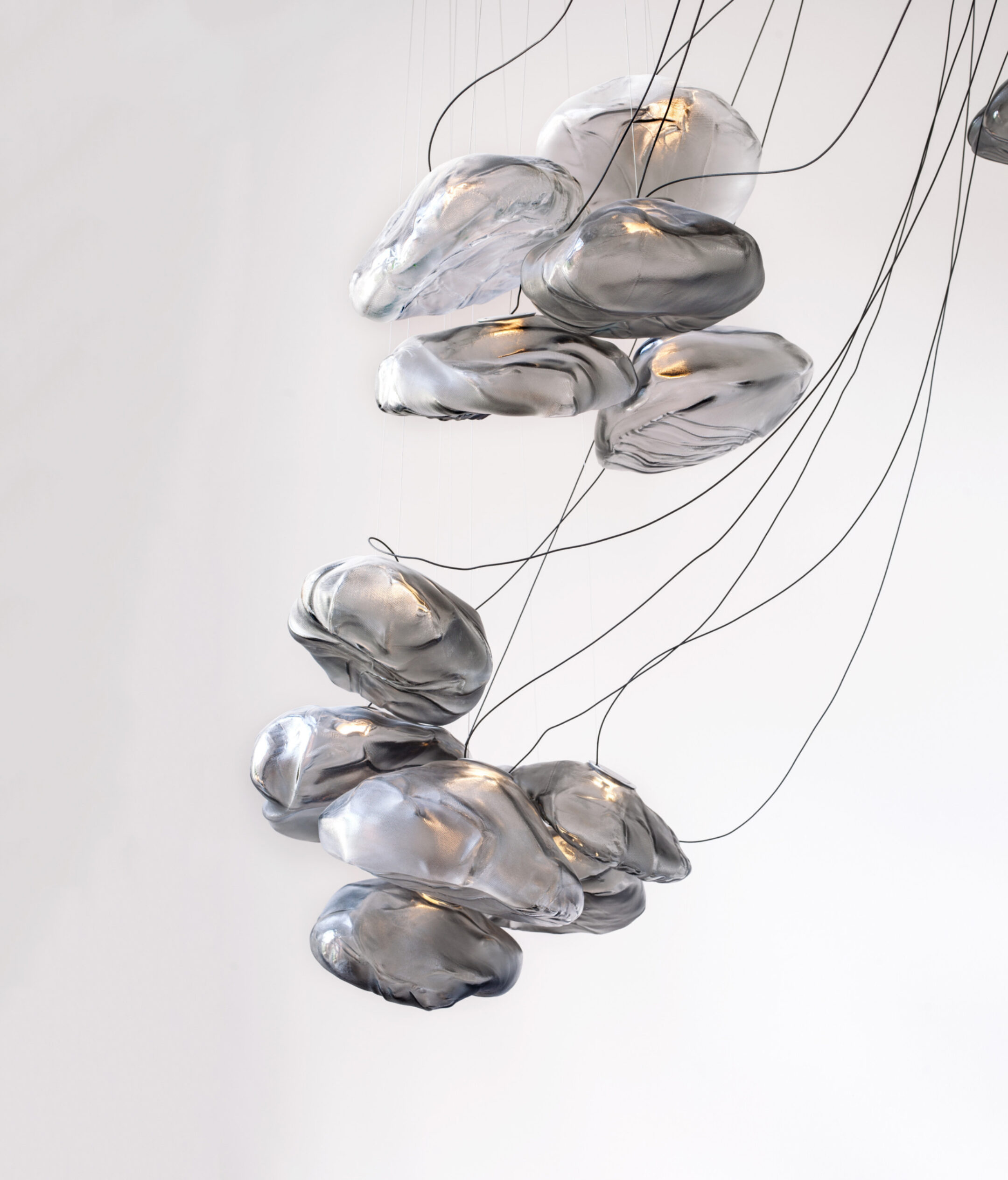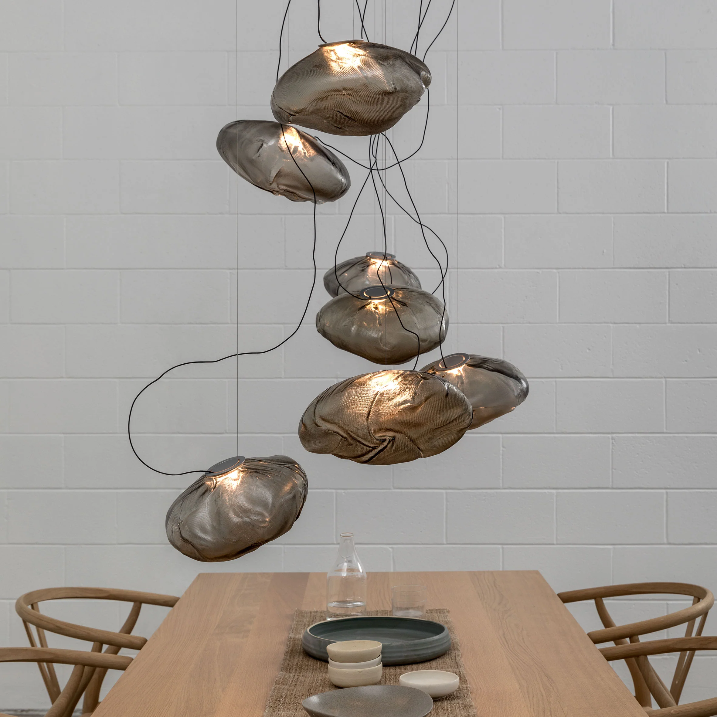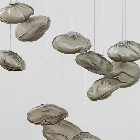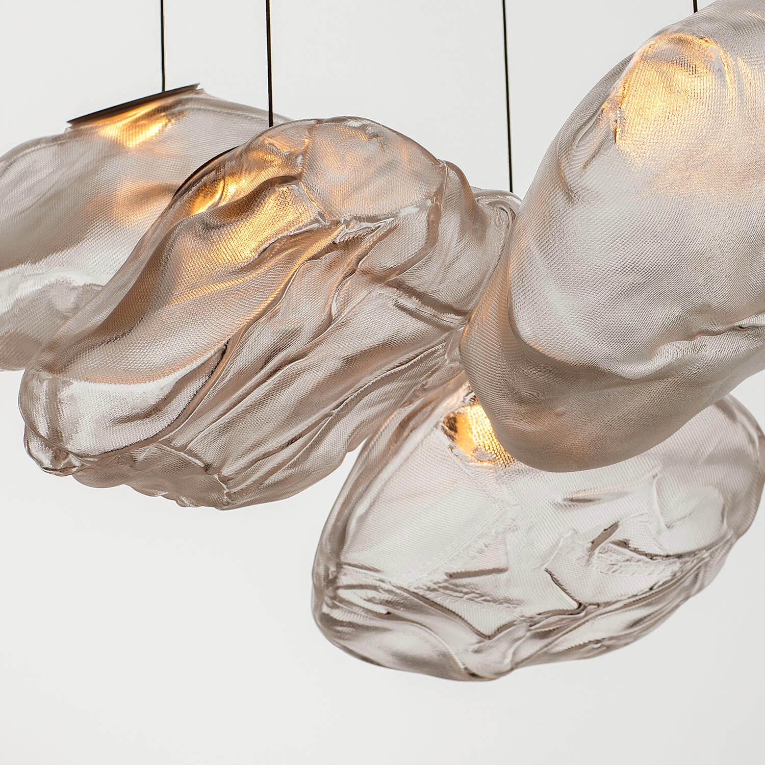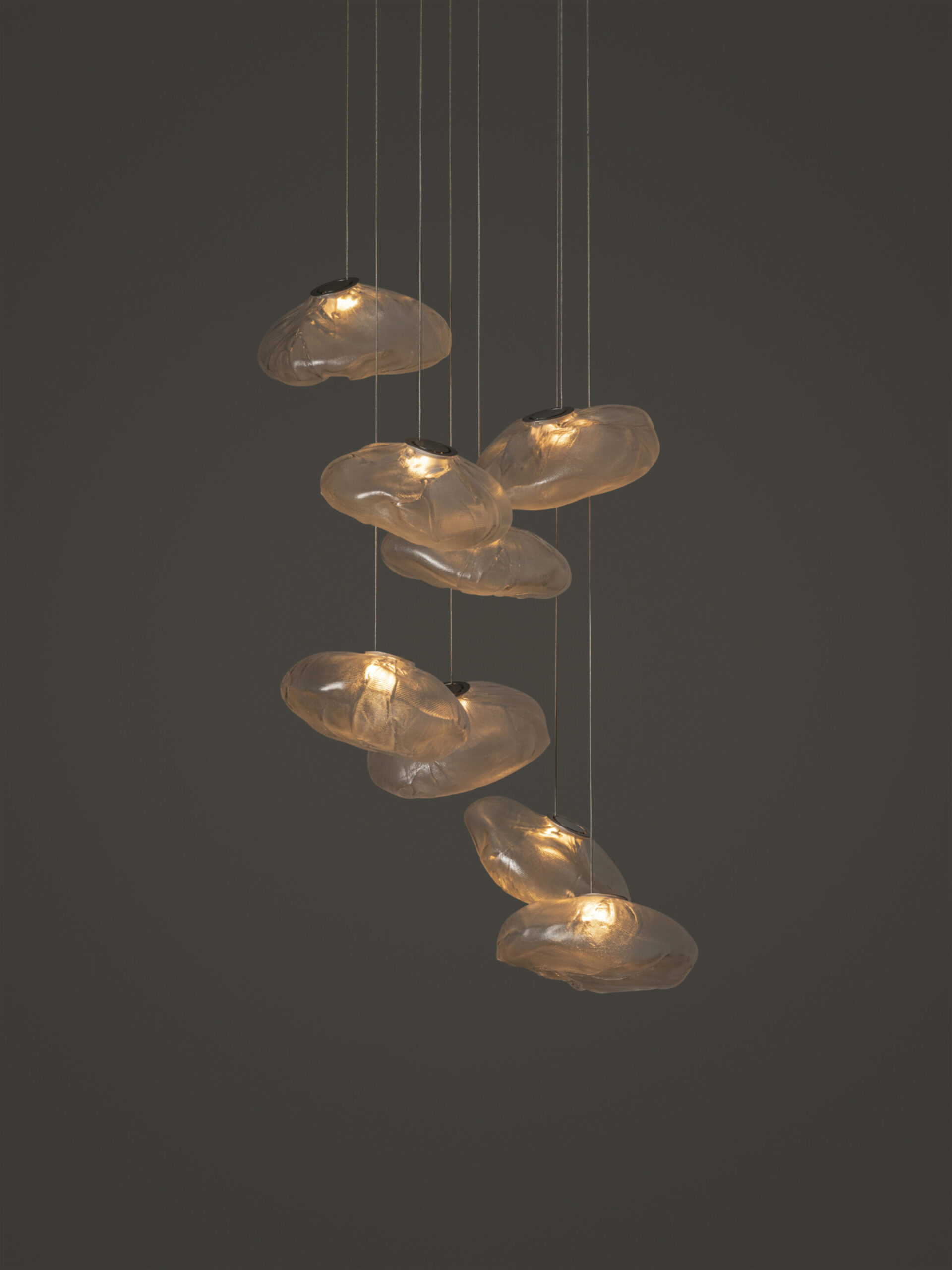 La suspension 73 de Bocci naît d’un procédé singulier : le verre en fusion est coulé dans un tissu de céramique, qui, une fois retiré, imprime sa mémoire dans la matière.