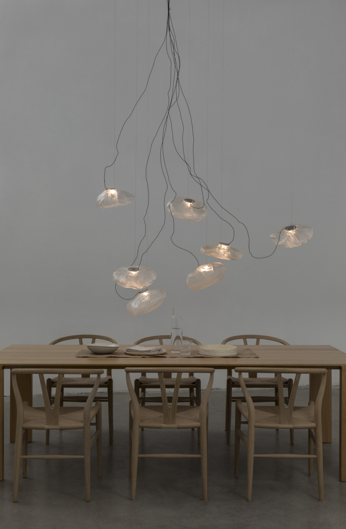 De ce geste artisanal émerge un luminaire solide, mais à l’apparence souple et délicate, empreint de poésie.
