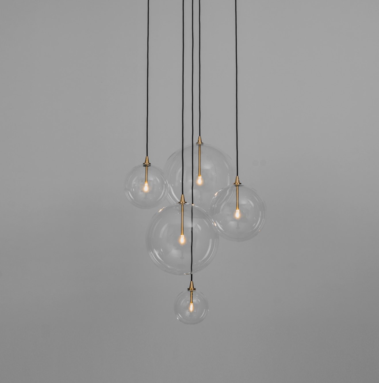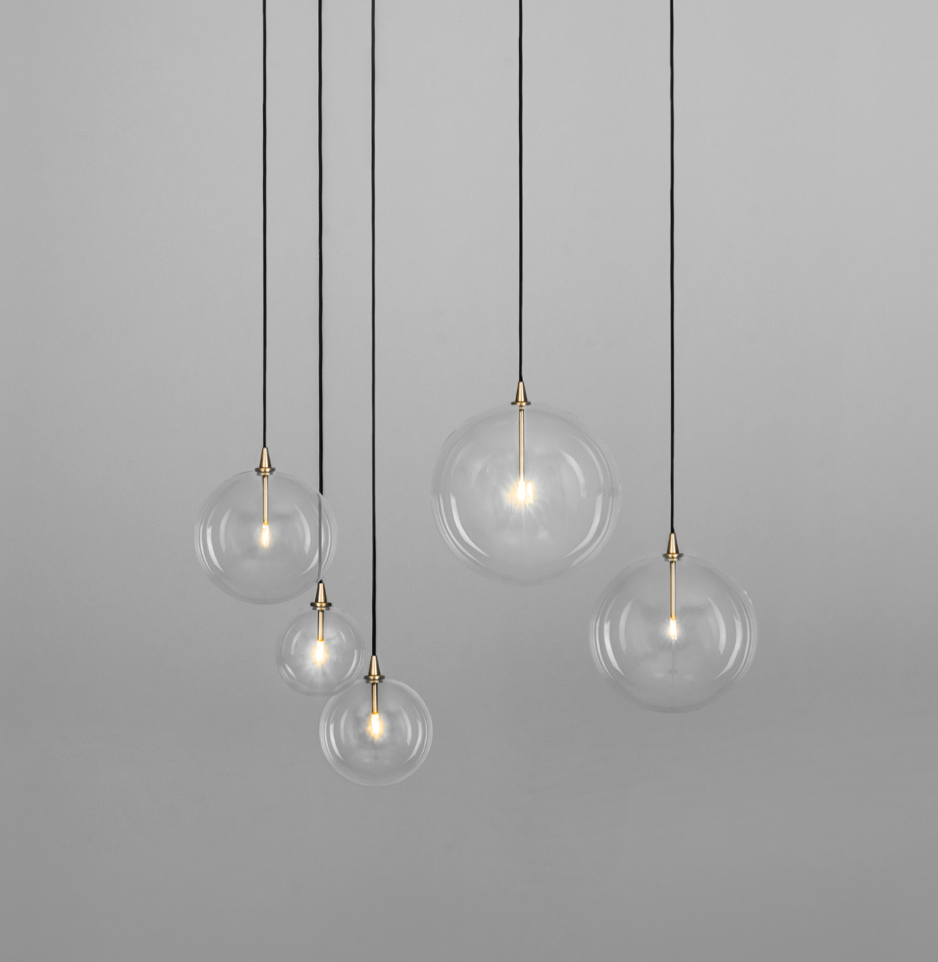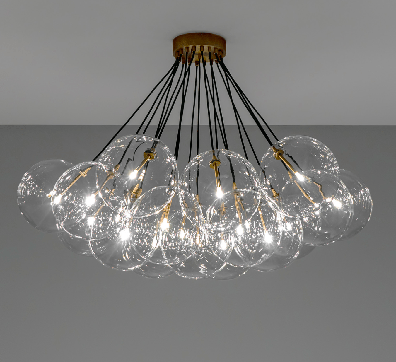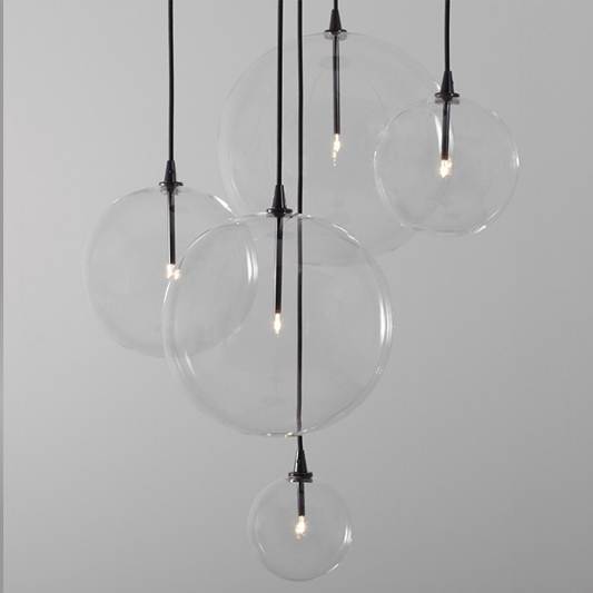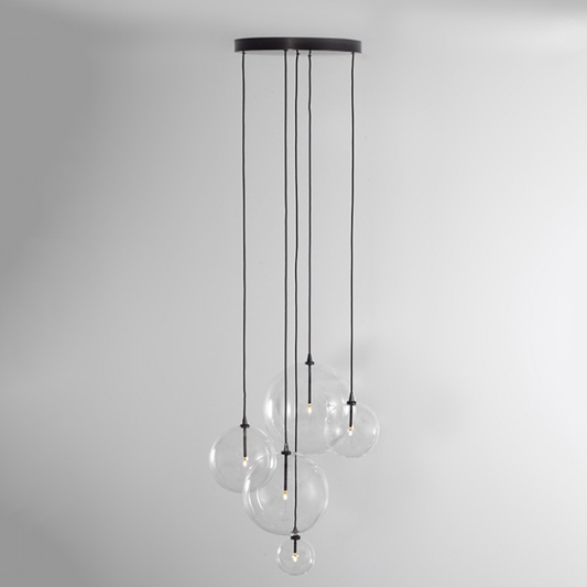 Ces sphères en verre soufflé transparent, suspendues à de fins câbles noirs, évoquent des bulles de savon flottant dans l’air et se posent avec délicatesse sur une structure en métal aux finitions laiton, chrome ou noir.