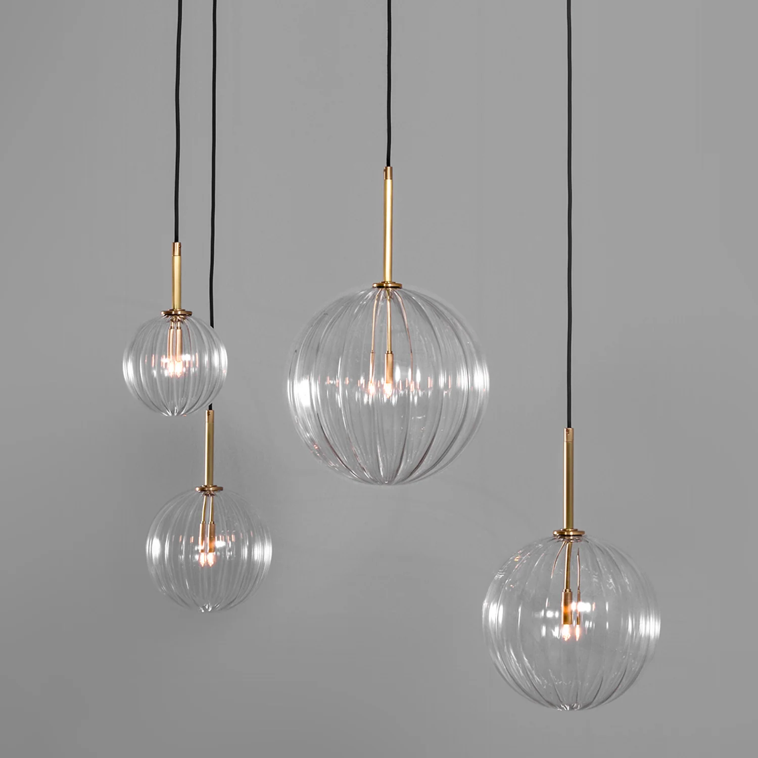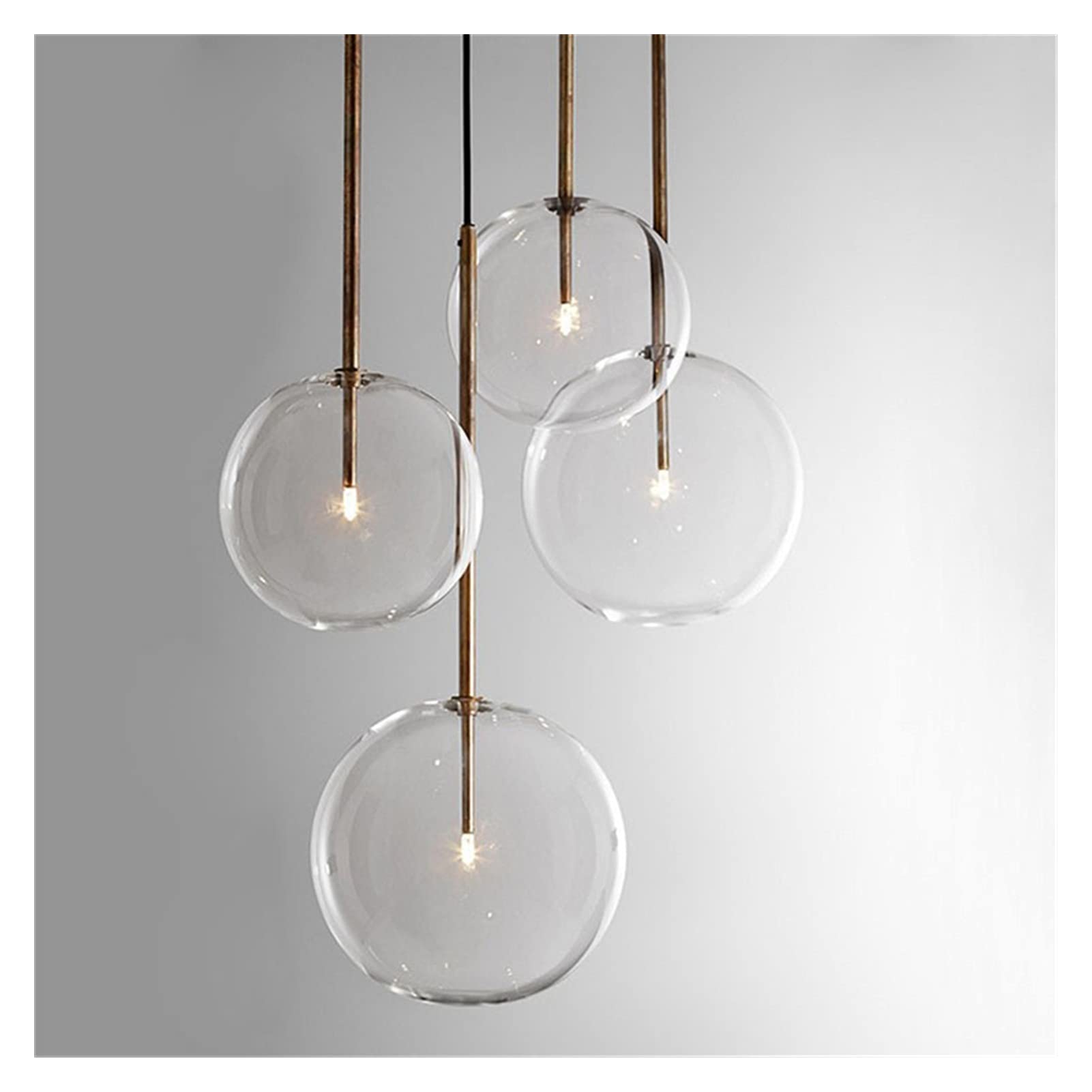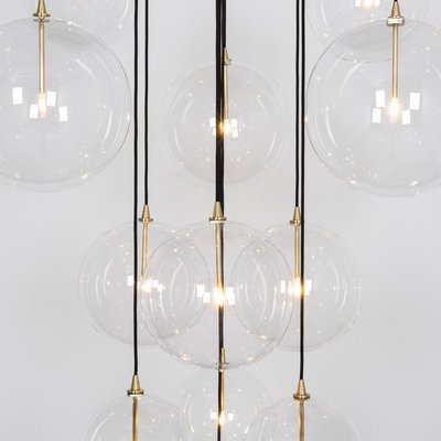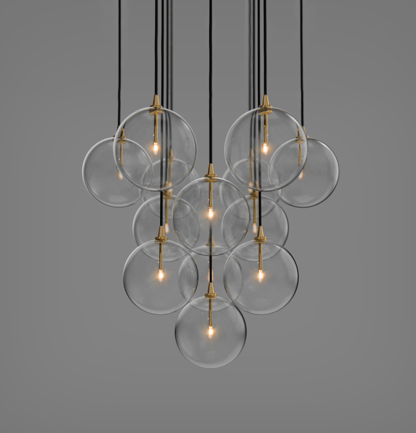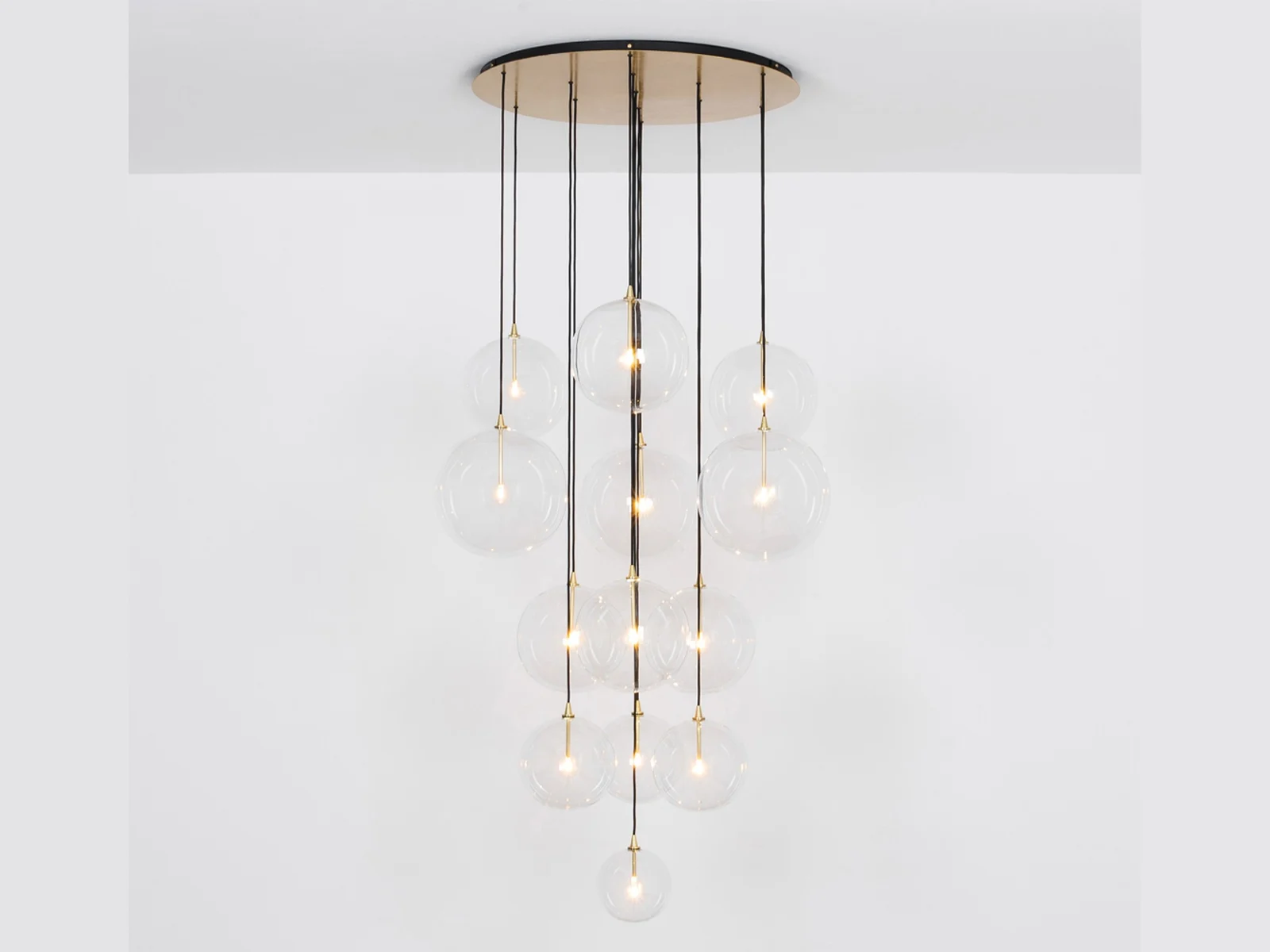 Ces sphères en verre soufflé transparent, suspendues à de fins câbles noirs, évoquent des bulles de savon flottant dans l’air et se posent avec délicatesse sur une structure en métal aux finitions laiton, chrome ou noir.