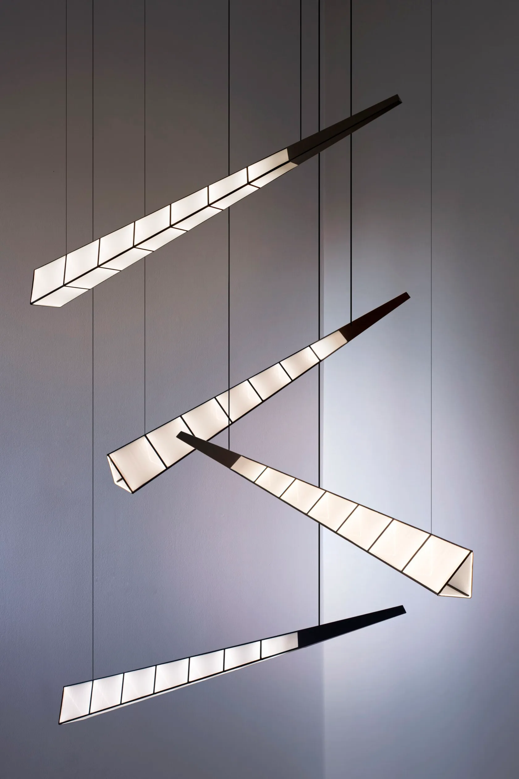 Igor, entité lumineuse suspendue en tissu indéchirable, déploie une géométrie épurée et sophistiquée qui diffuse une lumière douce et intemporelle, entre immobilité et mouvement.