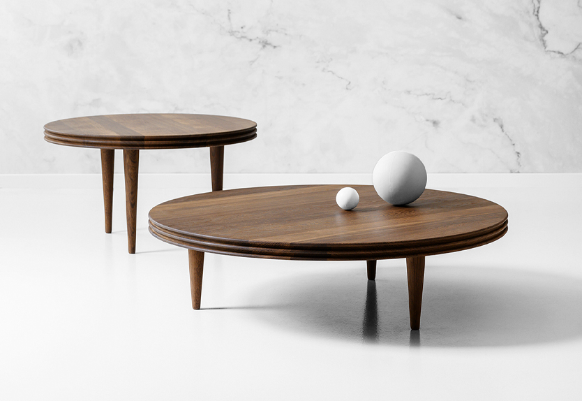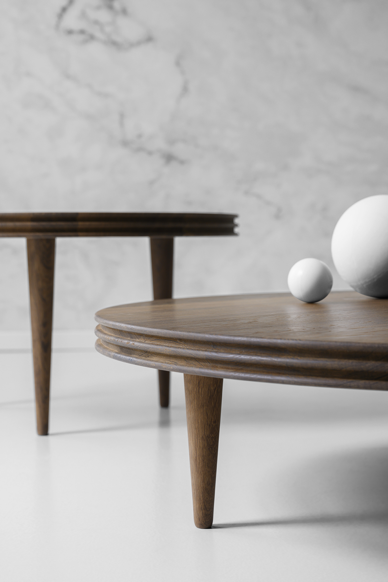 La structure naturelle du bois massif joue un rôle majeur dans la construction de la table, parfaitement accompagnée par des détails de design saisissants. Les pieds coniques en bois massif soulèvent l’impressionnant plateau d’une épaisseur de 5 cm, ce qui est tout à fait remarquable pour une table basse en bois massif. Les rainures horizontales sur le bord de la table sont réalisées avec une tête de fraisage spéciale sur mesure, inventée et construite par Christian Troels.