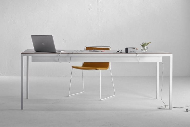Cette collection se décline en table de repas, table de réunion et bureau avec étagère, permettant de s’adapter à des usages résidentiel ou professionnel.