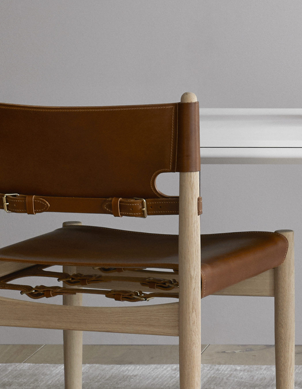 Sa structure en bois massif soutient un siege et dossier interchangeables en cuir de selle tanné végétal avec boucles en métal.
