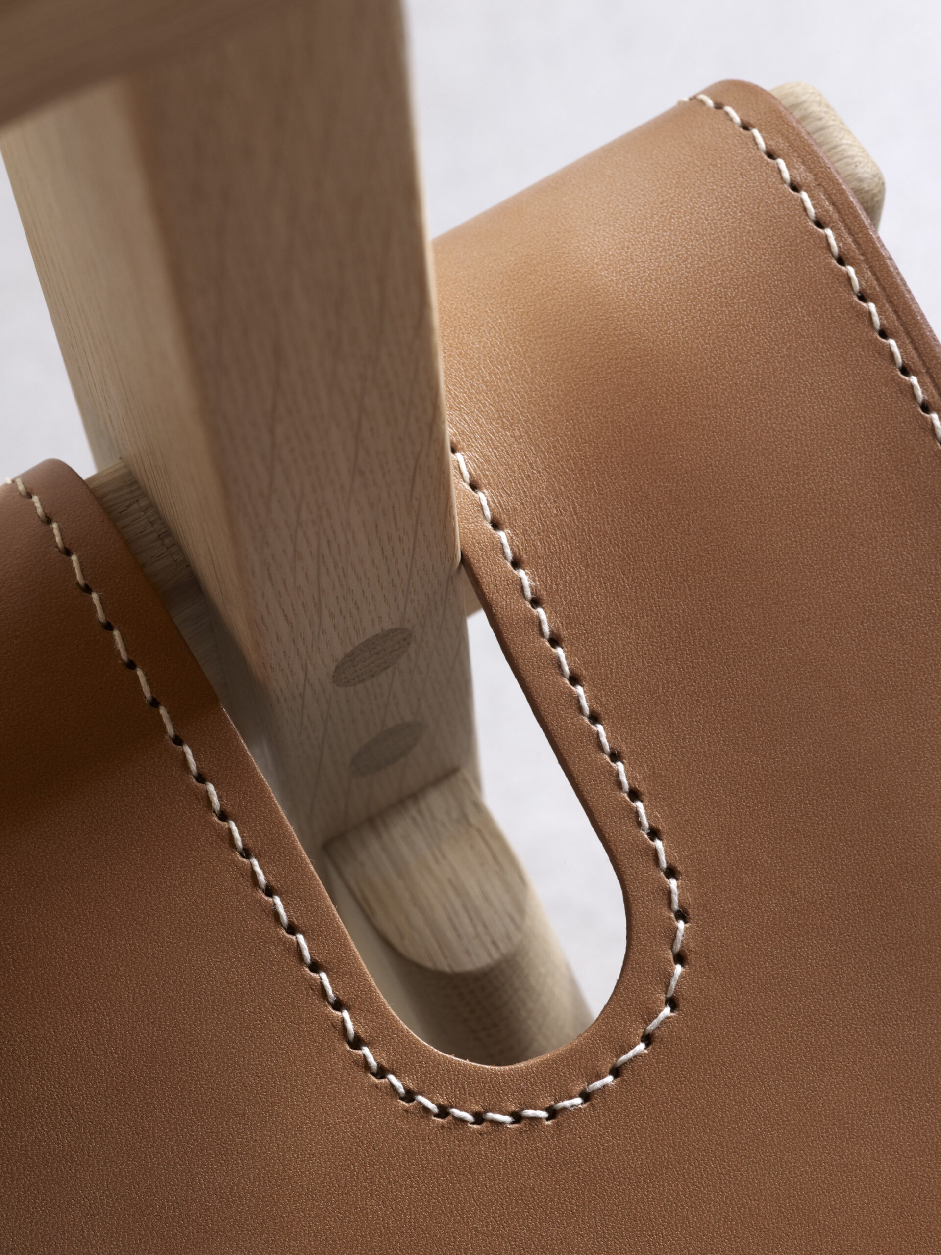 Sa structure en bois massif soutient un siege et dossier interchangeables en cuir de selle tanné végétal avec boucles en métal.