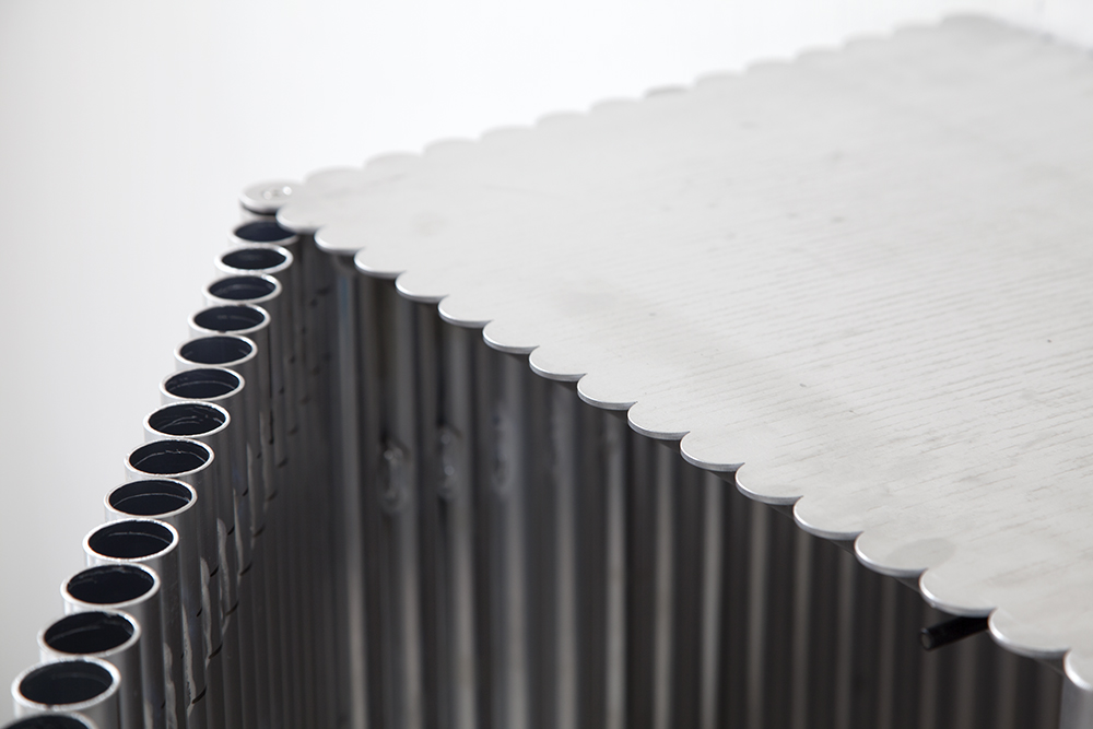 ALLTUBES cabinet low fait partie de la série ALLTUBES de Muller Van Severen, une collection fondée sur la répétition de tubes ronds en aluminium brut.